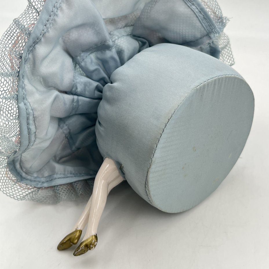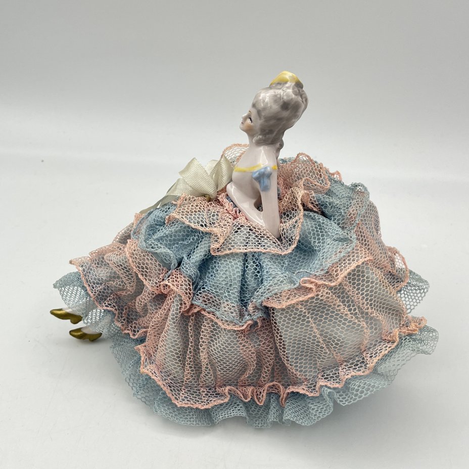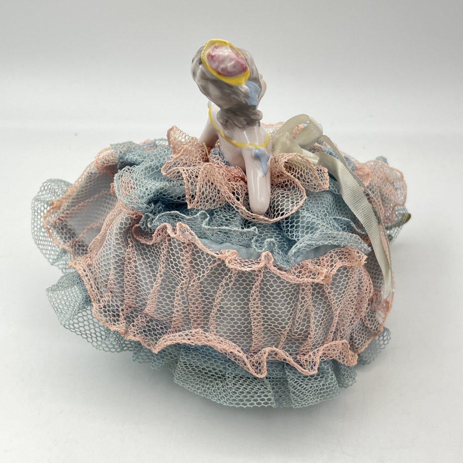 Игольница в виде дамы в розово-голубом кружевном платье, фарфор, роспись, ткань, Германия, 1950-1970 гг.