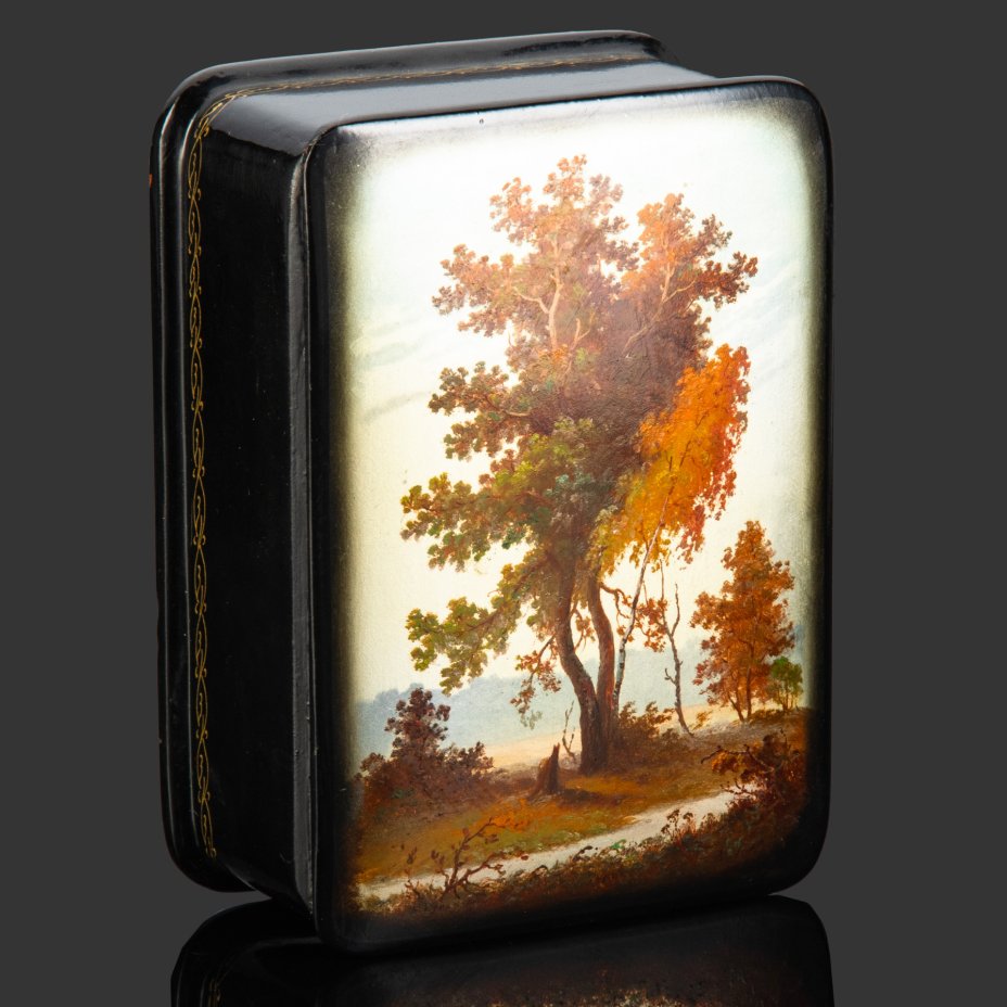Шкатулка с лаковой миниатюрой по мотивам картины В.М.Васнецова "Витязь на распутье", художник С.Маслов, папье-маше, масло, лак, Федоскинская фабрика миниатюрной живописи (Федоскино), СССР, 1965 г.