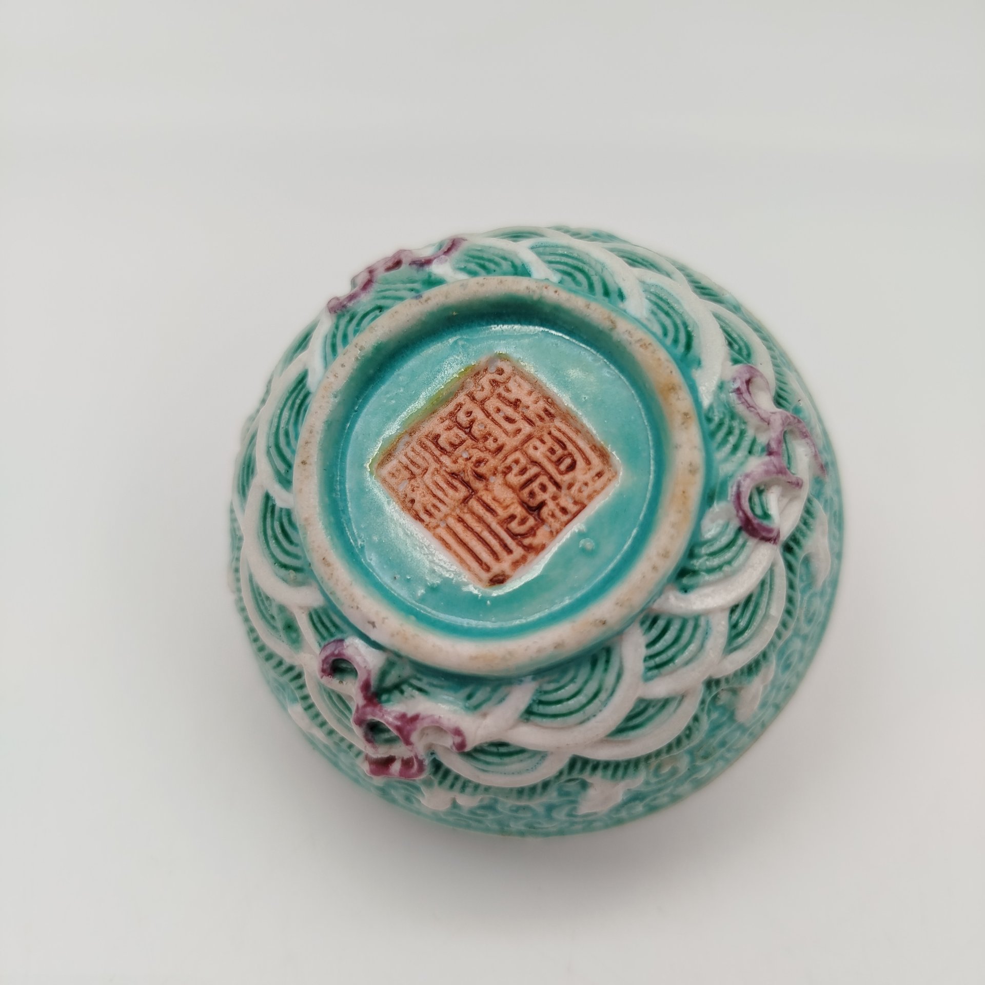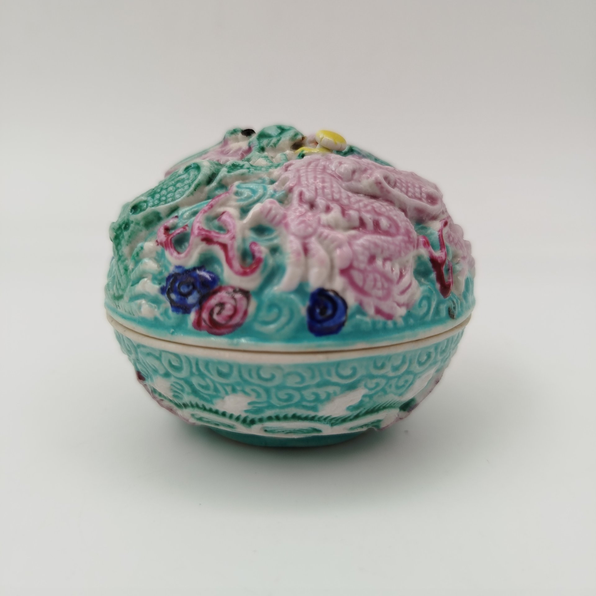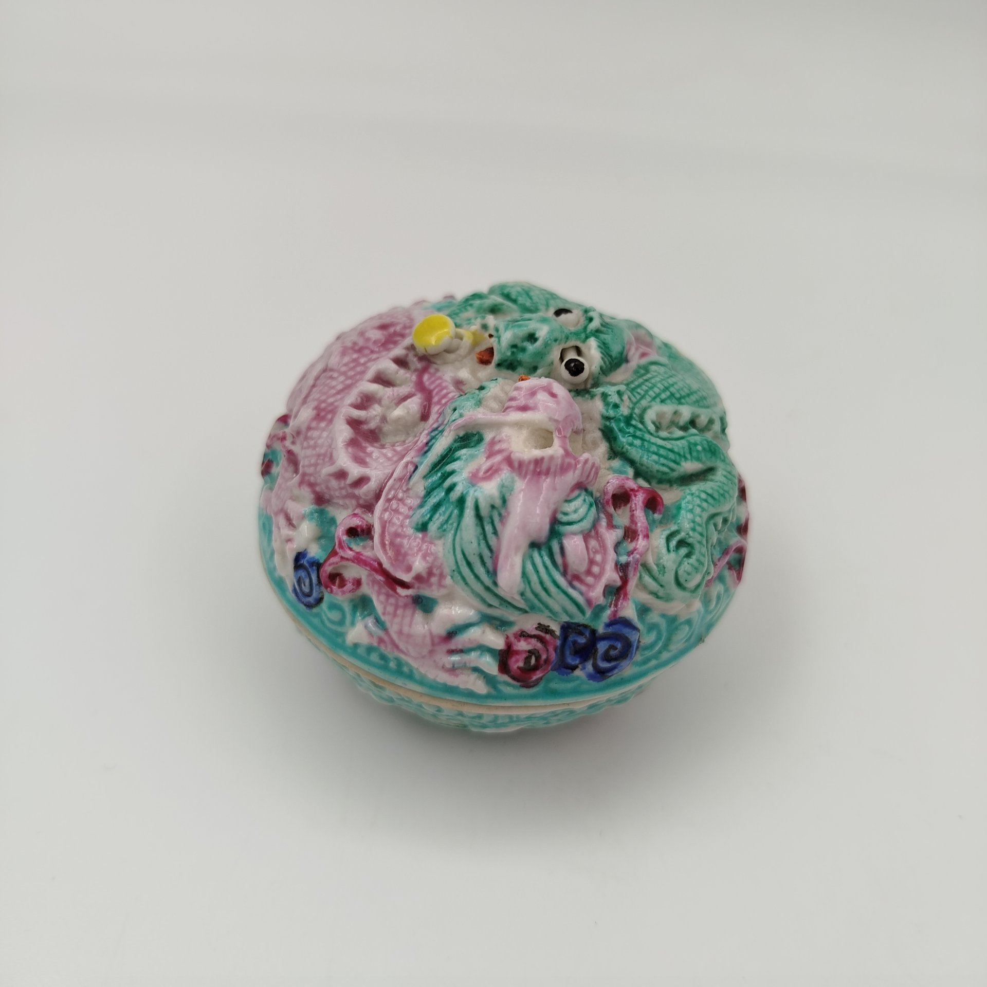 Купить Шкатулка с рельефным изображением сцены "шуан лун си чжу" в виде двух драконов, играющих с огненной жемчужиной, выполненная в стилистике эпохи Цин, фарфор, роспись, Китай, 1950-1970 гг.