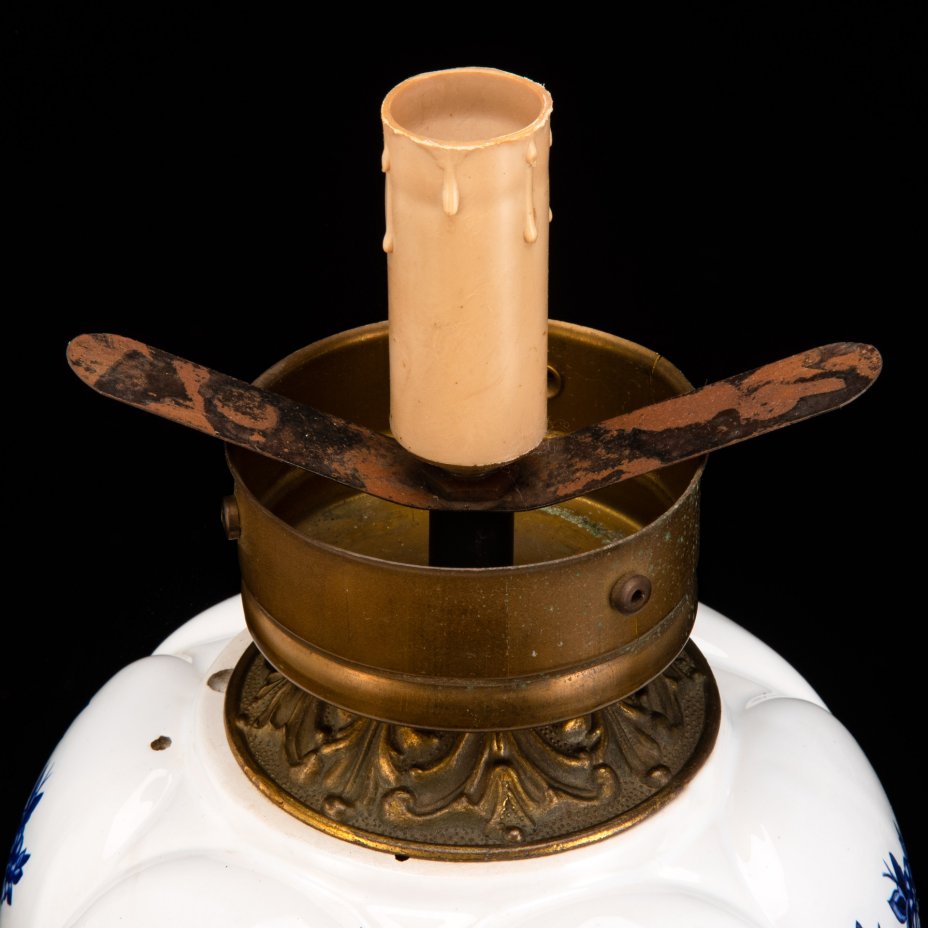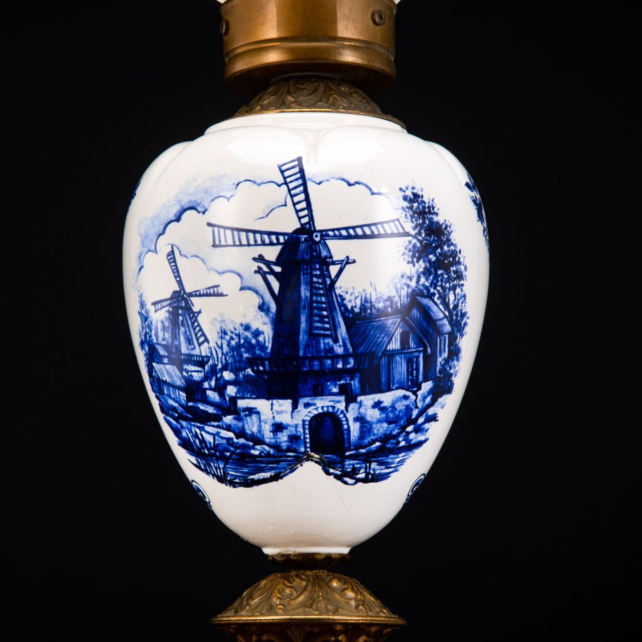 Лампа настольная, декорированная изображением голландского пейзажа с мельницами, фаянс, деколь, сплав металлов, стекло, матирование, Нидерланды, 1960-1990 гг.