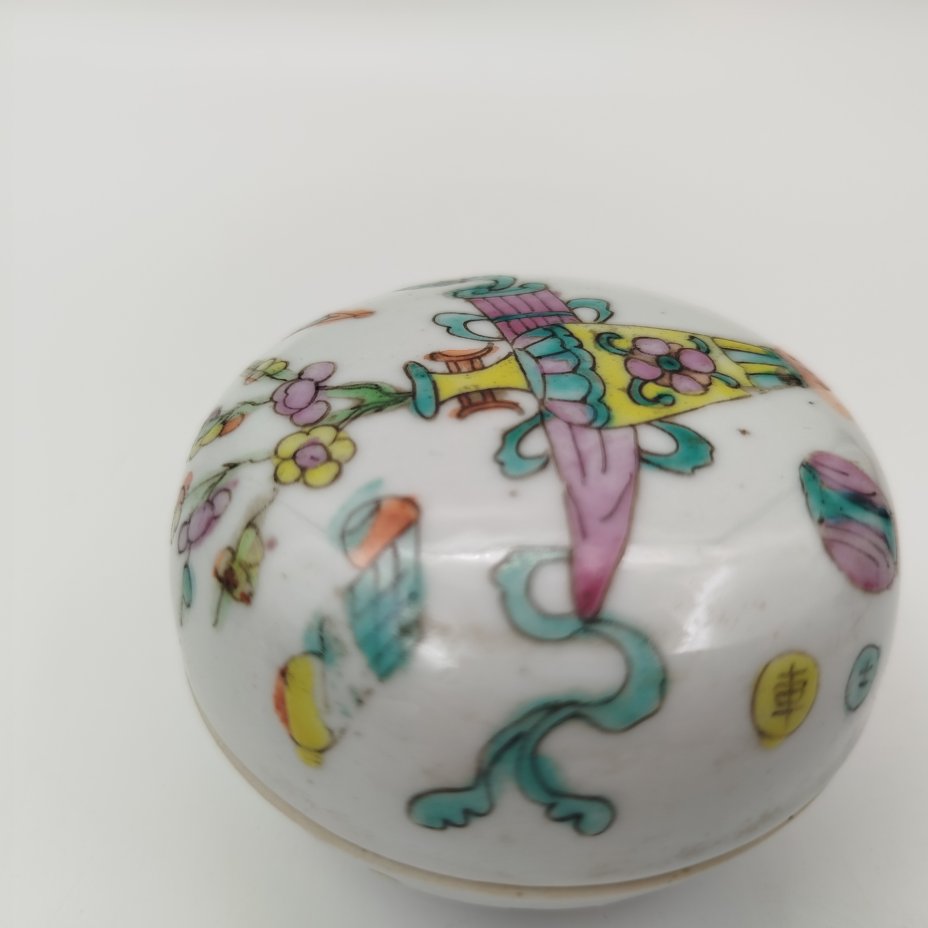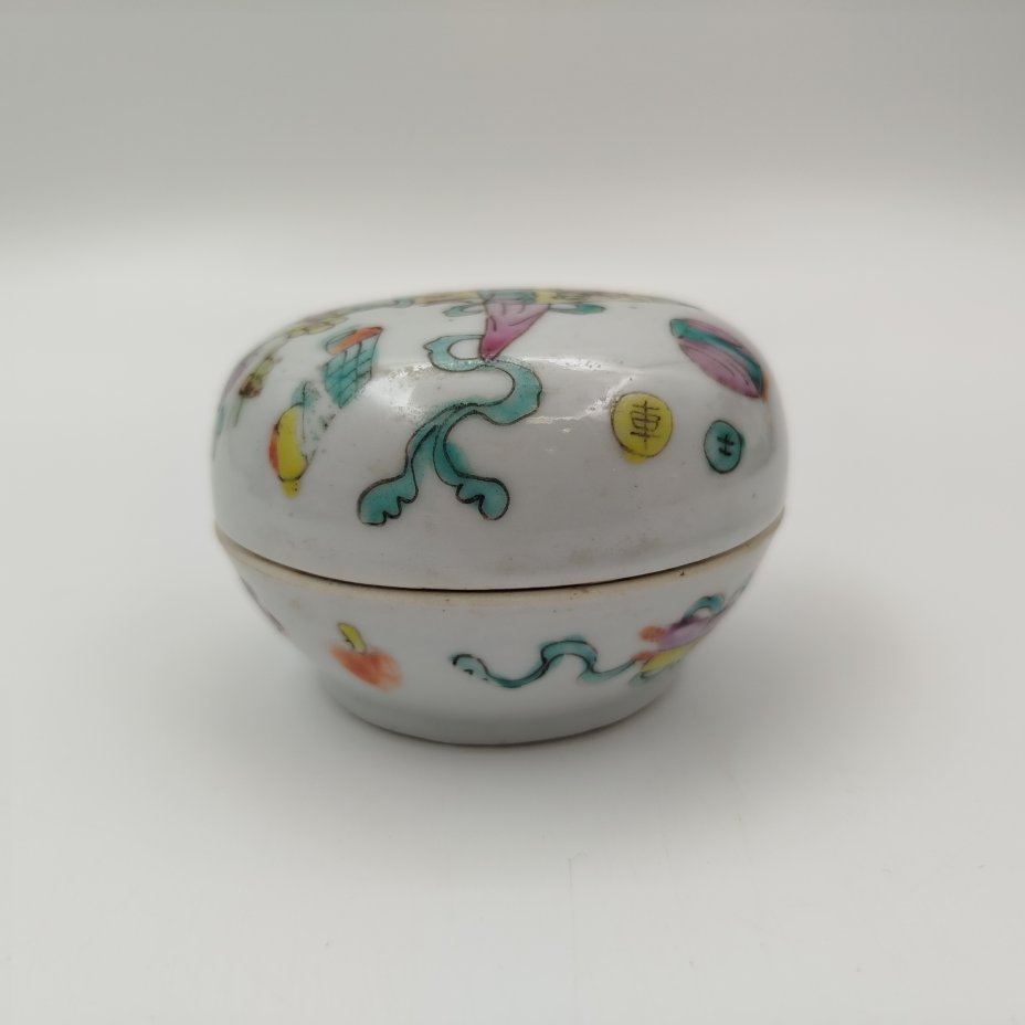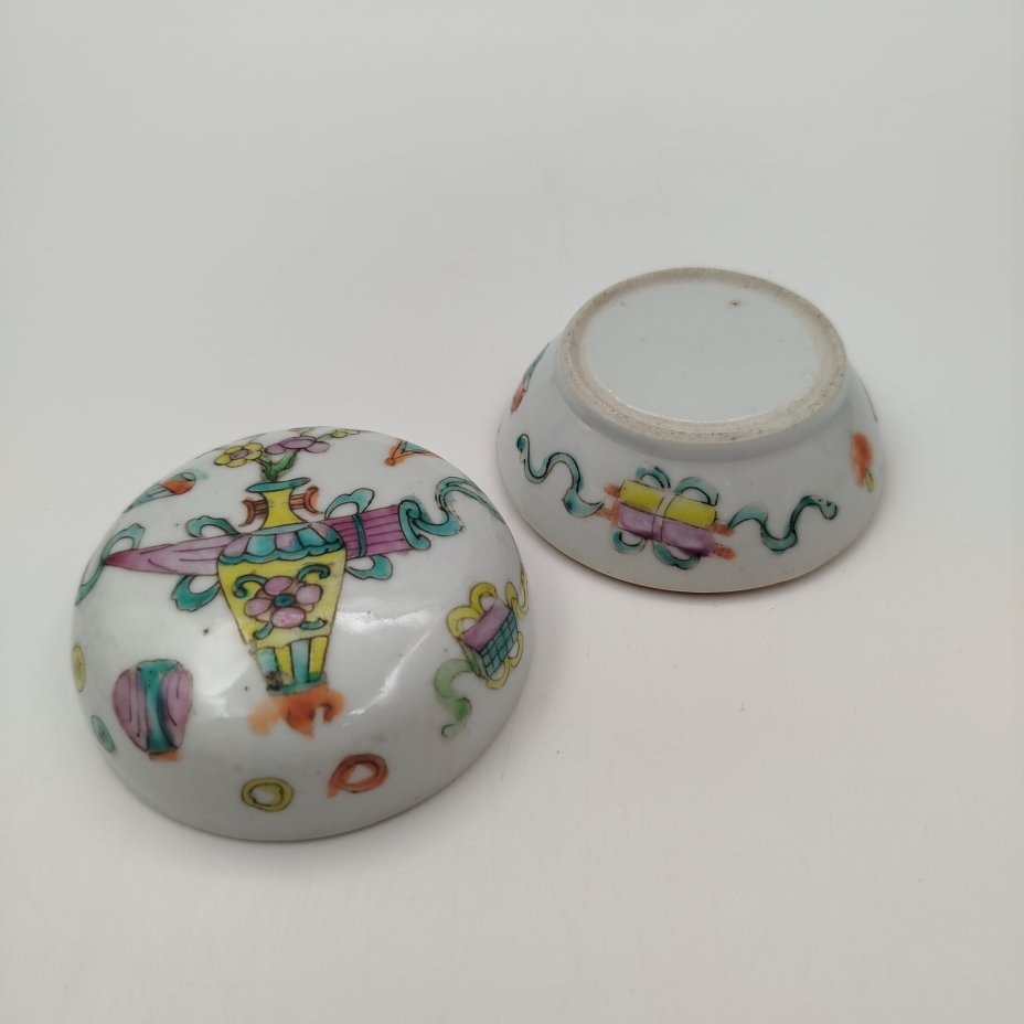 Шкатулка для пудры (пудренница) украшенная изображениями символов восьми бессмертных, фарфор, роспись, Китай, 1912-1949 гг.