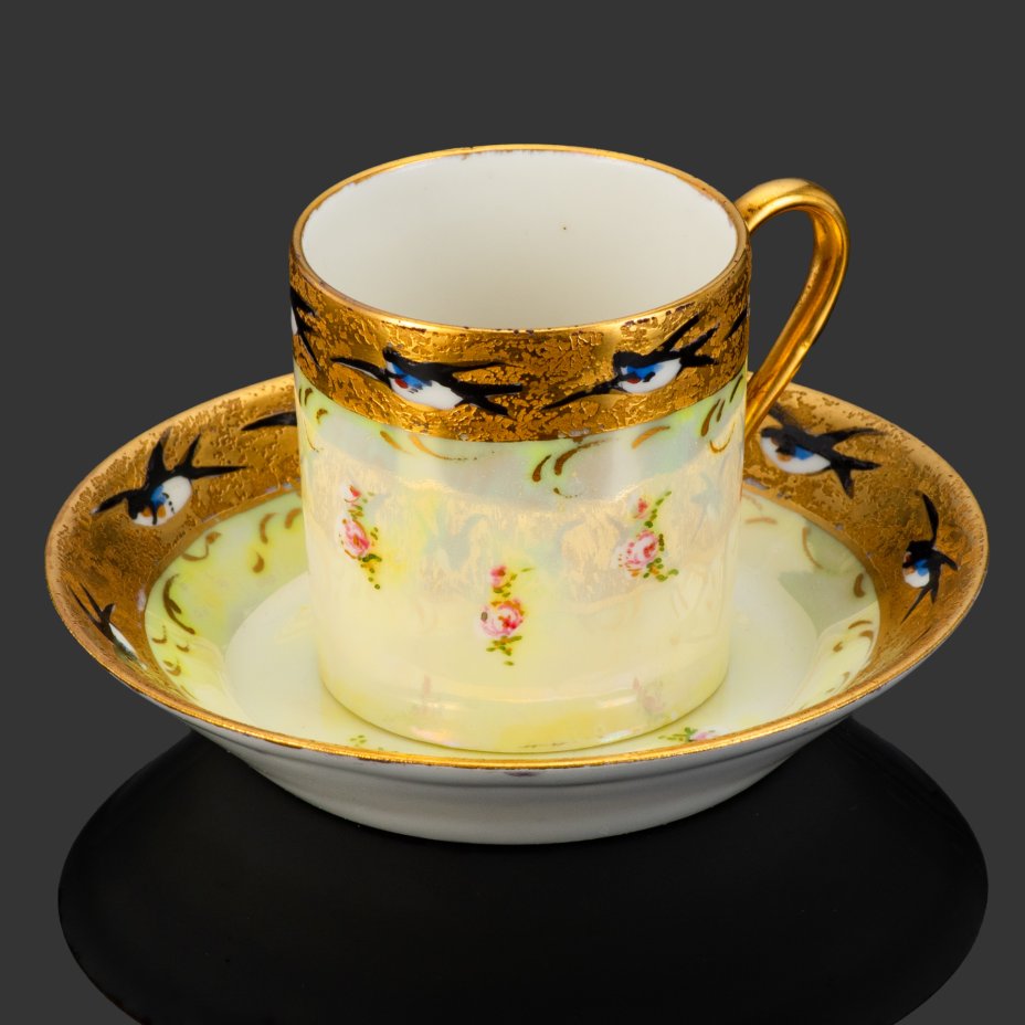 Кофейная пара, украшенная цветочными мотивами и изображением ласточек на золотой кайме, La Porcelaine Limousine (LP), фарфор, люстр, роспись, золочение, Limoges, Франция, 1905-1930 гг.