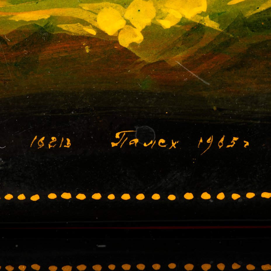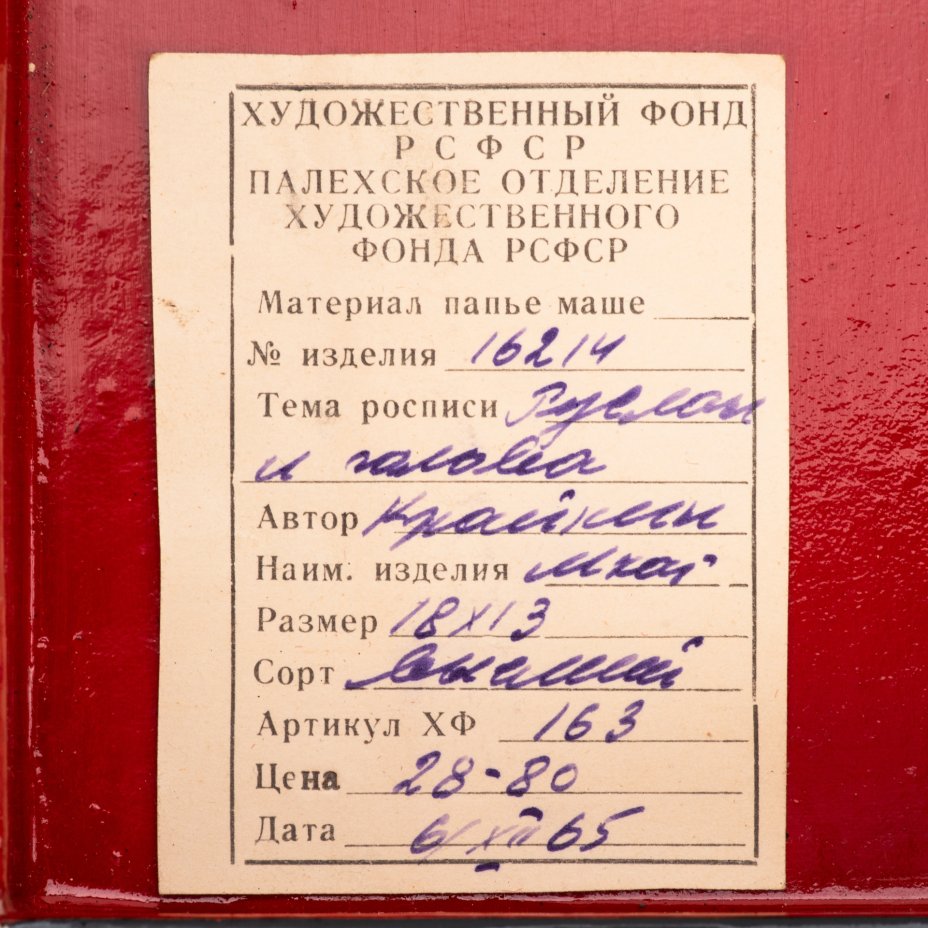 Шкатулка с лаковой миниатюрой "Бой Руслана с головой", автор Крайнин А., № 16213, папье-маше, роспись, лак, Палех, СССР, 1965 г.