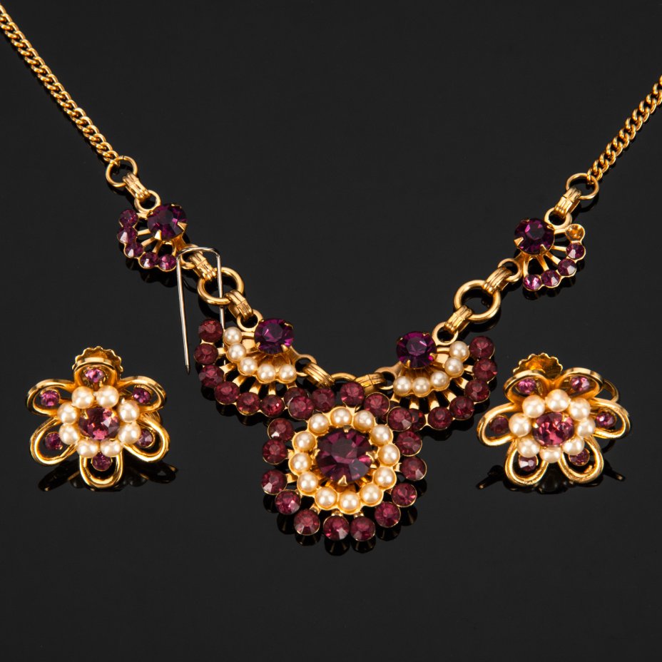 Набор из колье и клипс, Phyllis Originals, в оригинальной коробке, металл, (бижутерный сплав), золочение, стразы, США, 1940-1960 гг.