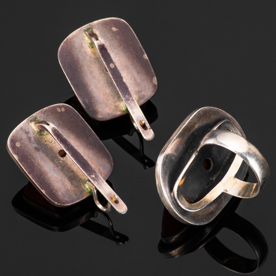 Набор женских украшений (серьги, кольцо) лаконичной формы с крупными вставками, металл, кораллоид Бамбу (bamboo), СССР, 1970-1990 гг.