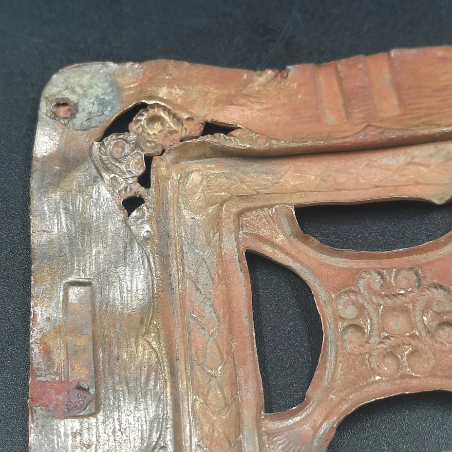 Пряжка женская поясная с ажурными растительными элементами и изображением дельфинов, металл, штамповка, Российская империя, 1890-1915 гг.