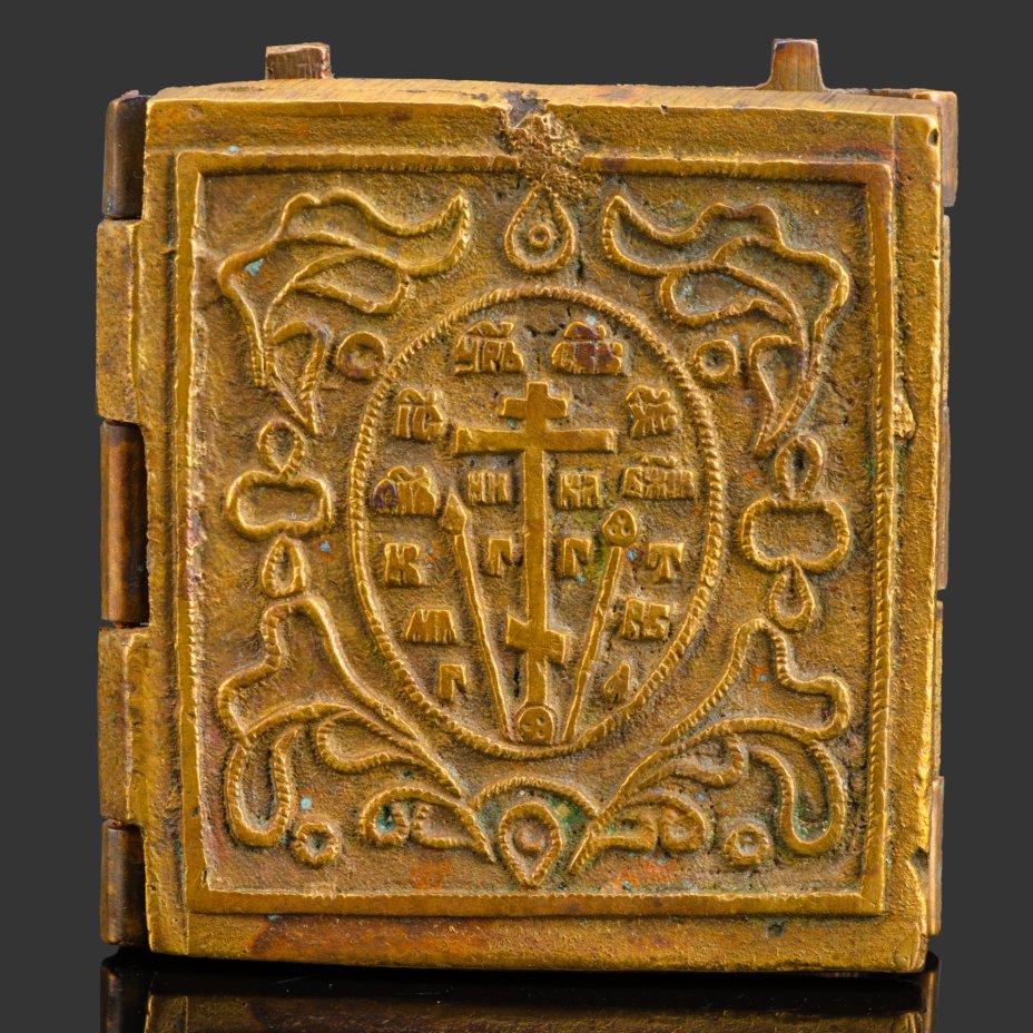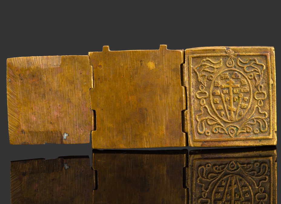 Складень трехстворчатый "Святитель Никола Чудотворец., Богоматерь Всех скорбящих радость, Избранные святые", латунь, полихромные эмали, Российская империя, 1850-1890 гг.