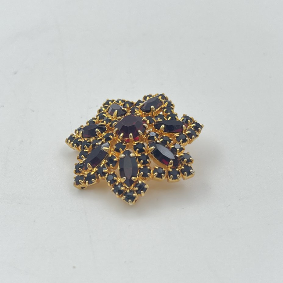 Брошь винтажная круглой формы, со вставками бордового цвета, металл, золочение, стекло, Чехословакия, 1950-1960 гг.