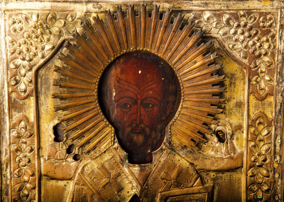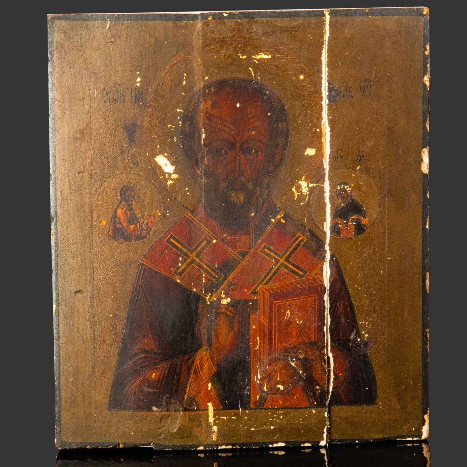 Икона "Святой Николай Чудотворец" в окладе, дерево, темпера, сплав металлов, Российская империя, 1880-1910 гг.