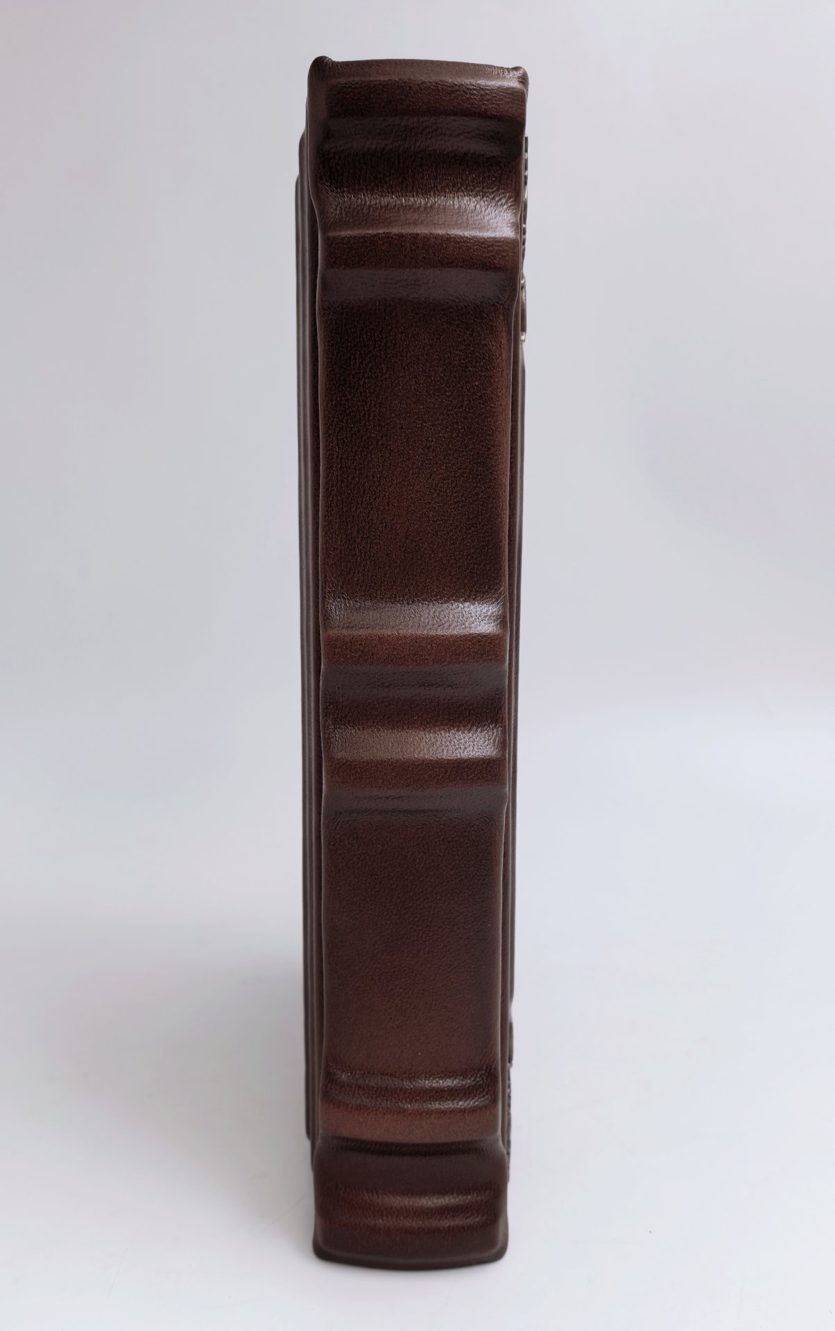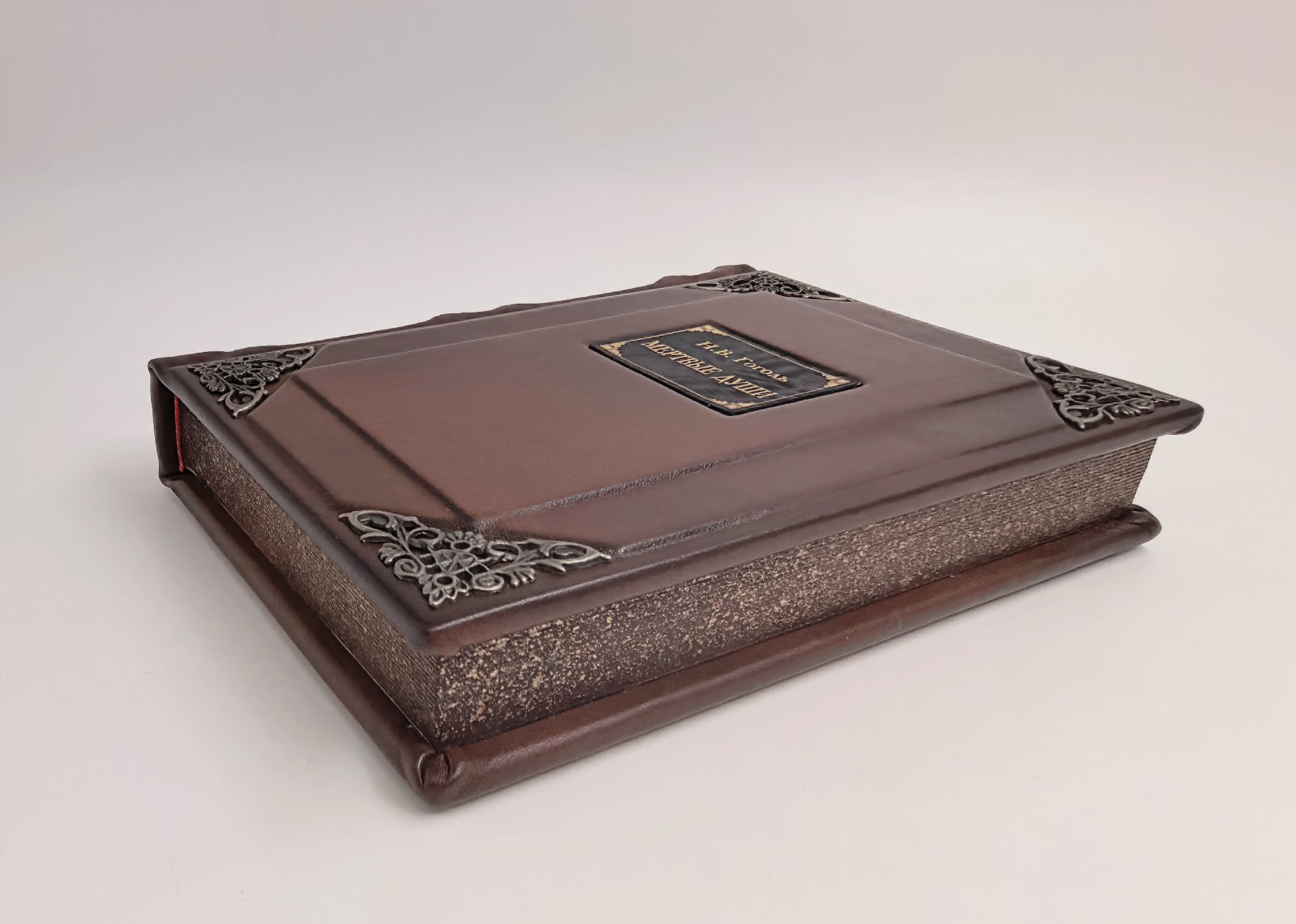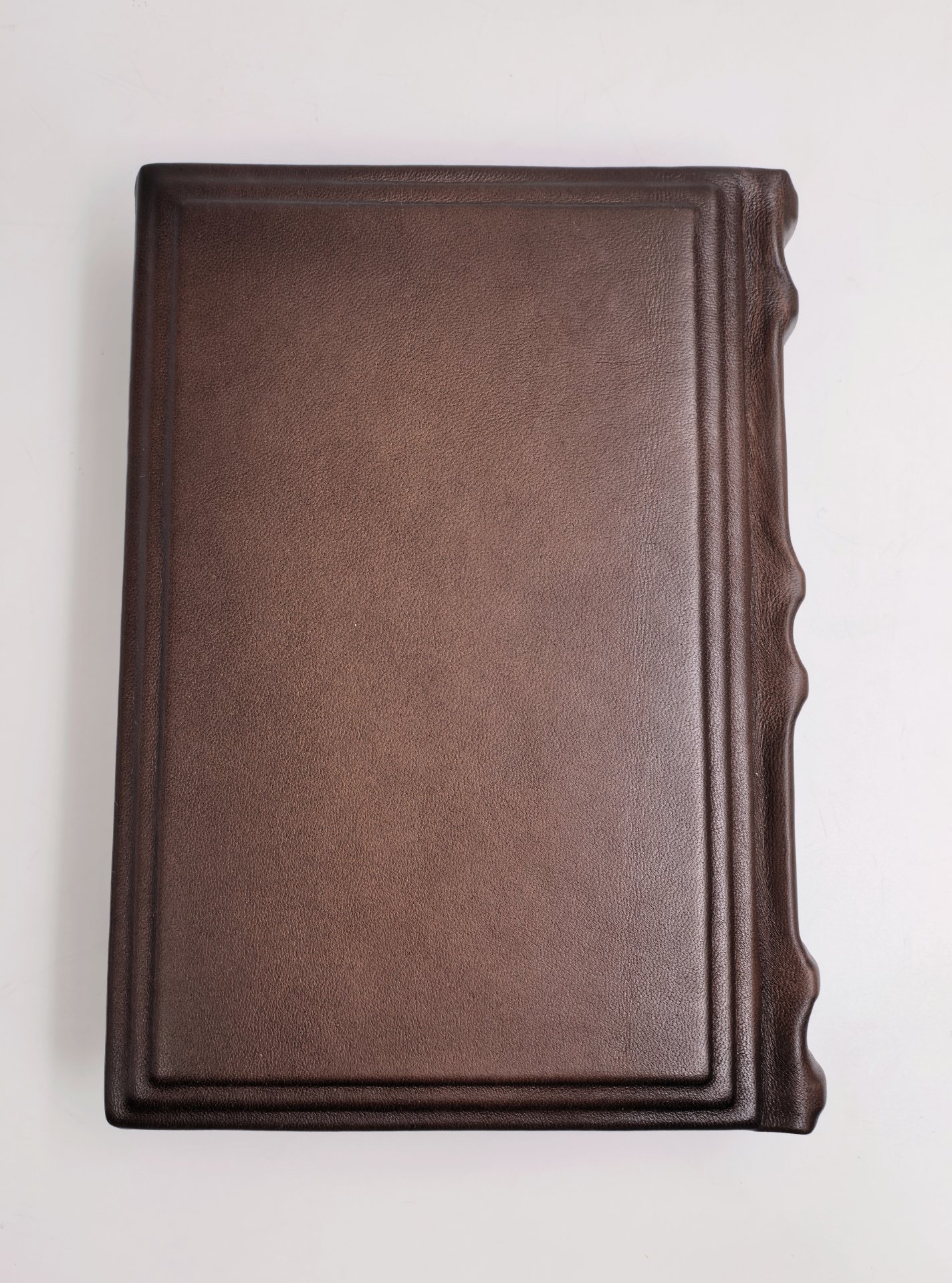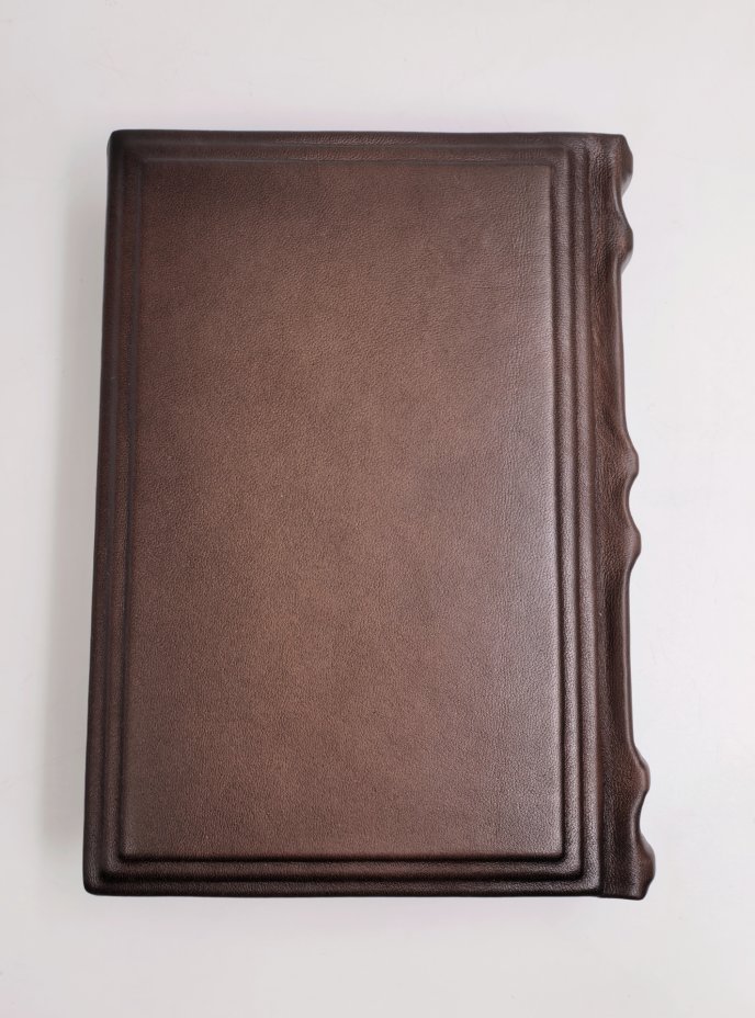 Подарочное издание. Обрез книги прокрашен вручную с наложением капель золотой краски. Переплёт изготовлен из натуральной овечьей кожи – авторская ручная работа.