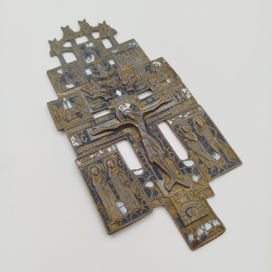 Крест киотный "Распятие с предстоящими, избранными иконами и святыми" староверов-поповцев, латунь, эмали, Российская империя, 1850-1900 гг.