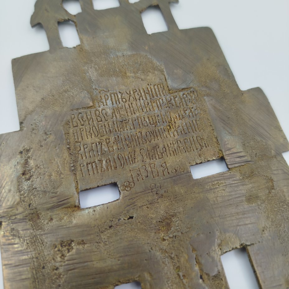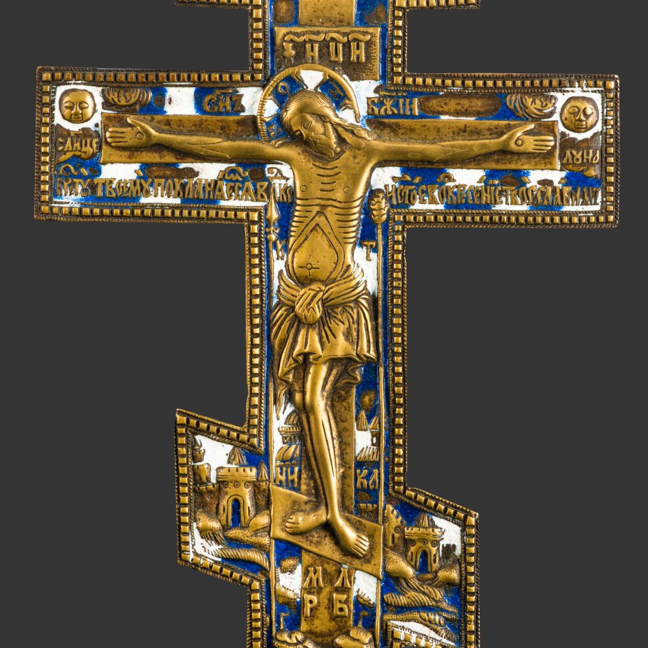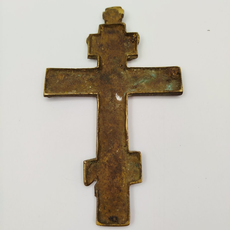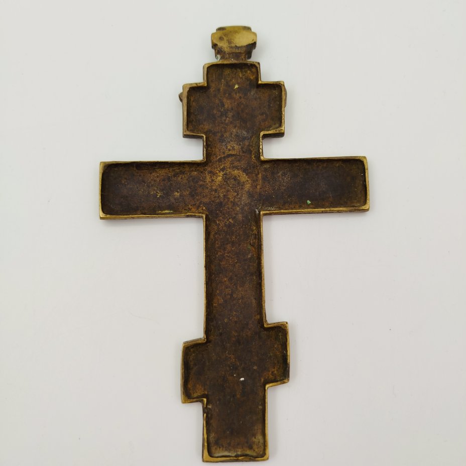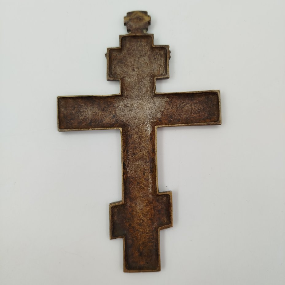 Крест киотный староверов-поповцев "Распятие Христово" (большой) с текстом "Крест — хранитель всей Вселенной..." на обороте, латунь, литьё, двухцветные эмали, Российская империя, 1850-1890 гг.