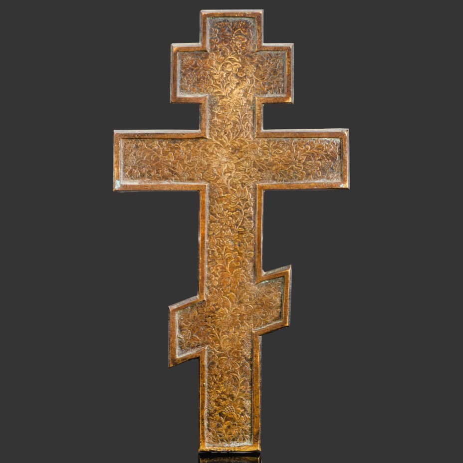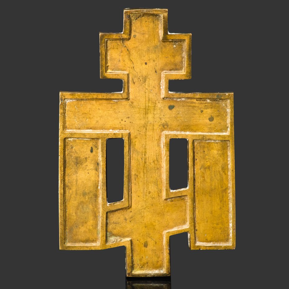 Крест киотный староверов-беспоповцев "Распятие Христово" с растительным декором на обороте (средний), латунь, двухцветная эмаль, Российская империя, 1850-1890 гг.