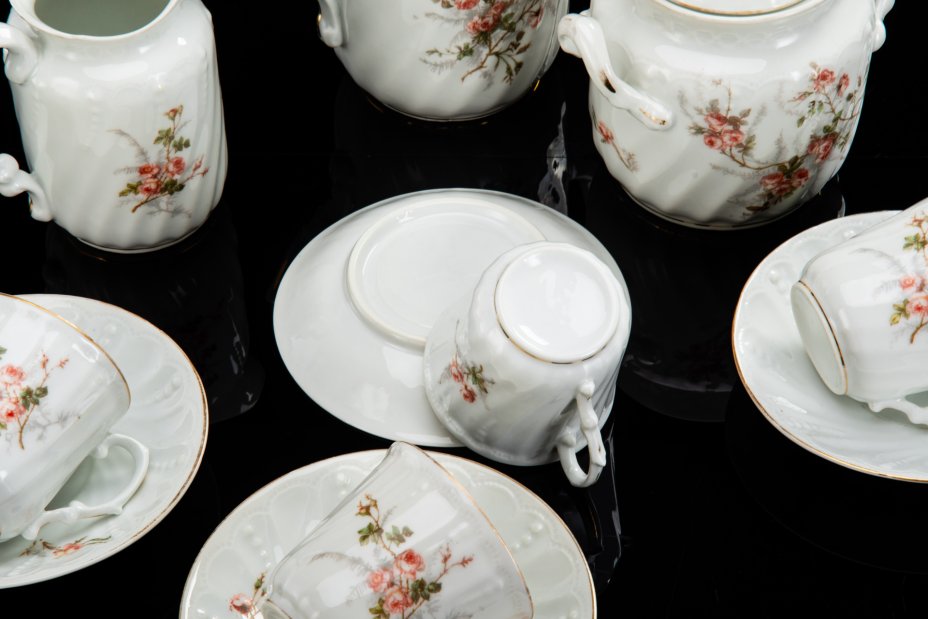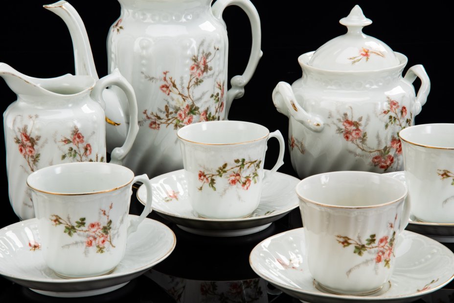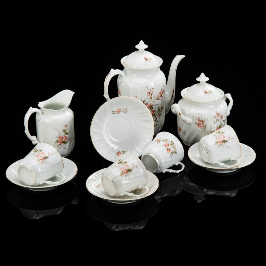 Сервиз кофейный с цветочным и рельефным декором на 4 персоны (11 предметов), фарфор, деколь, золочение, Западная Европа, 1890-1920 гг.