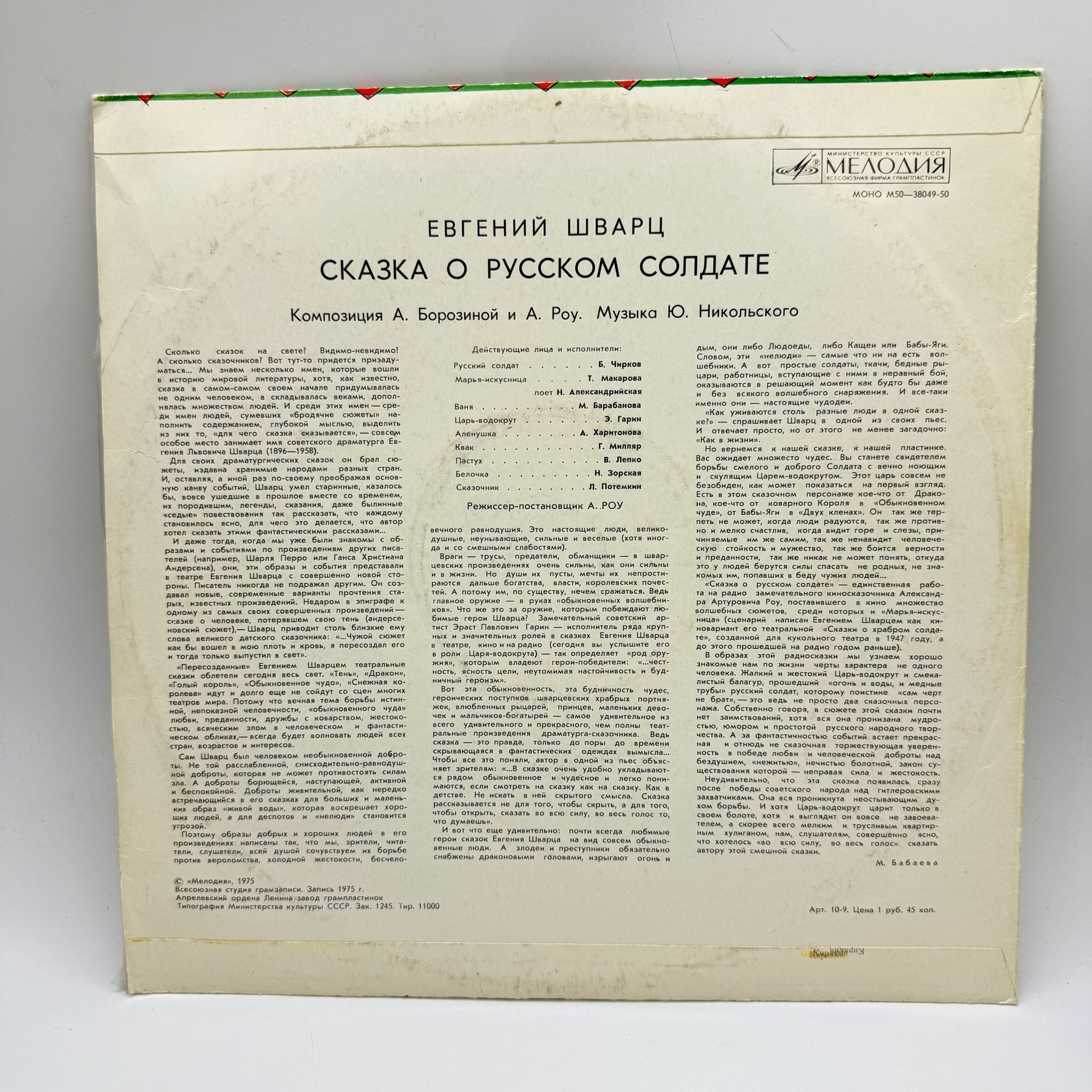 Грампластинка "Е. Шварц - Сказка о русском солдате ", LP (Long play), EX (excellent), композитный материал, картон, Всесоюзная фирма грампластинок «Мелодия», СССР, 1975 г.