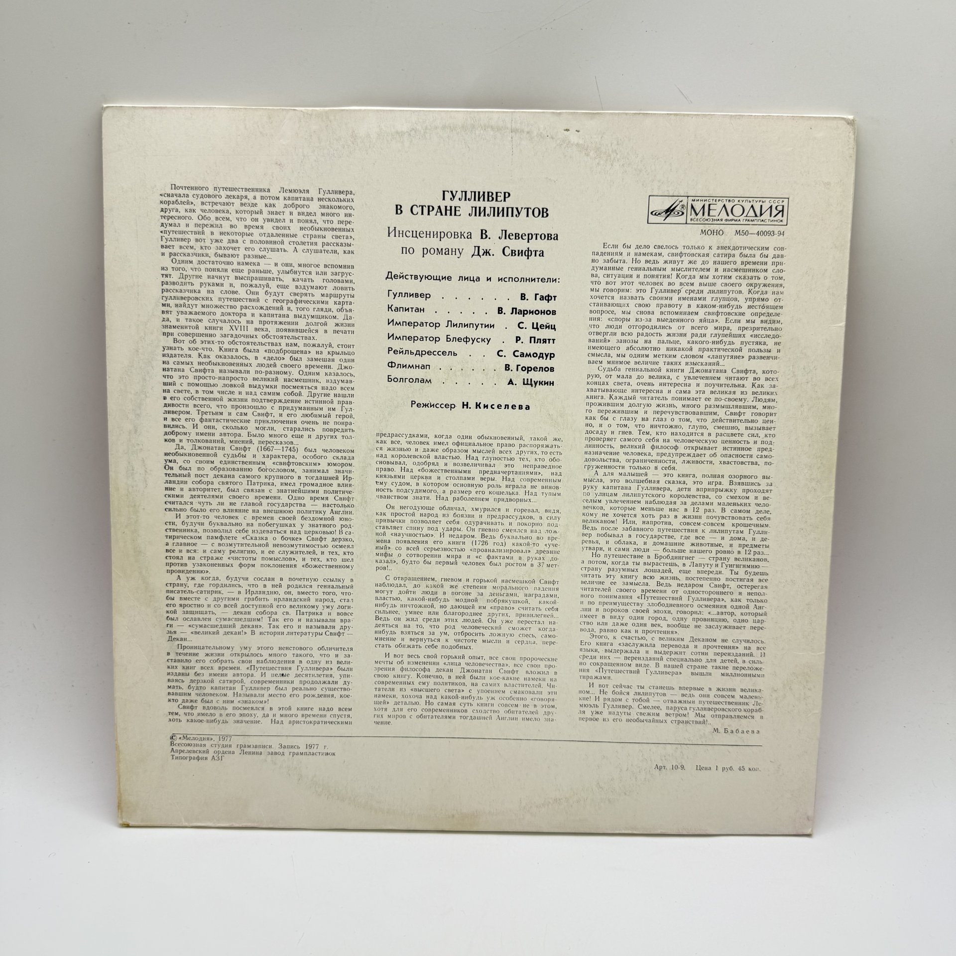 Грампластинка "Гулливер в стране лилипутов", LP (Long play), EX (excellent), композитный материал, картон, Всесоюзная фирма грампластинок «Мелодия», СССР, 1977 г.