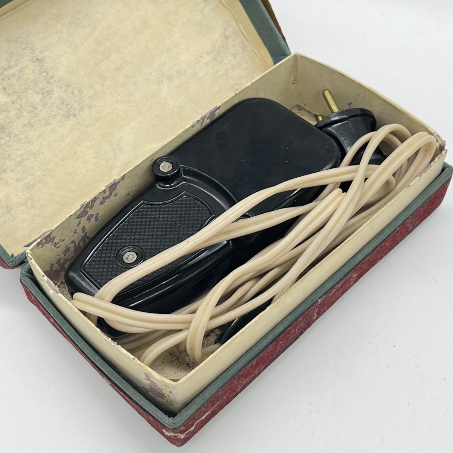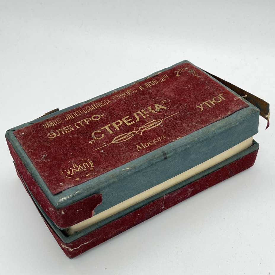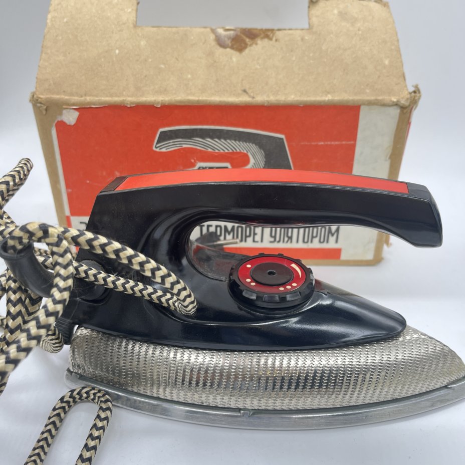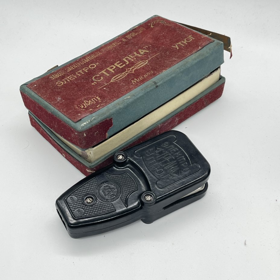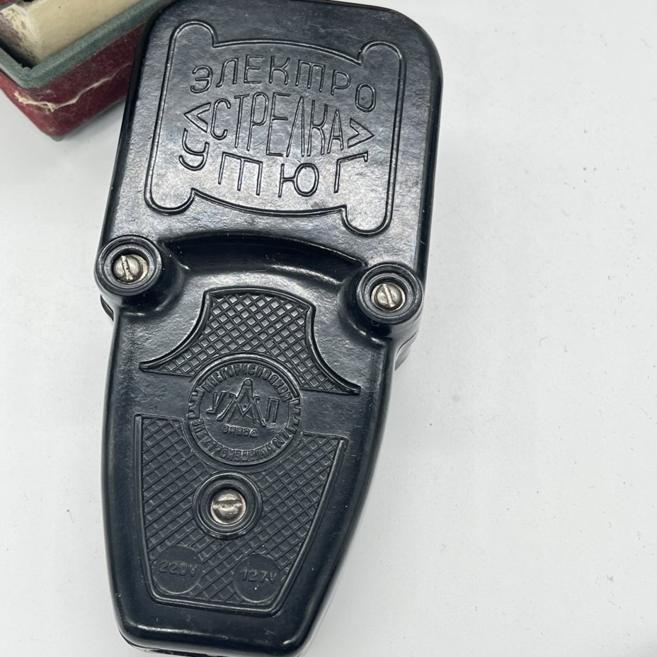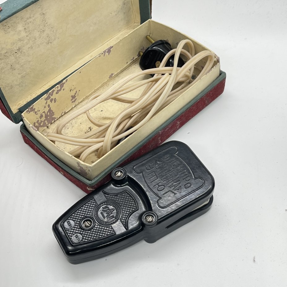 Утюг Электро-"Стрелка" для разглаживания стрелок на брюках в оригинальной коробке, Московской завод электробытовых приборов и проводов, пластик, картон, печать, СССР, 1960-1970 гг.