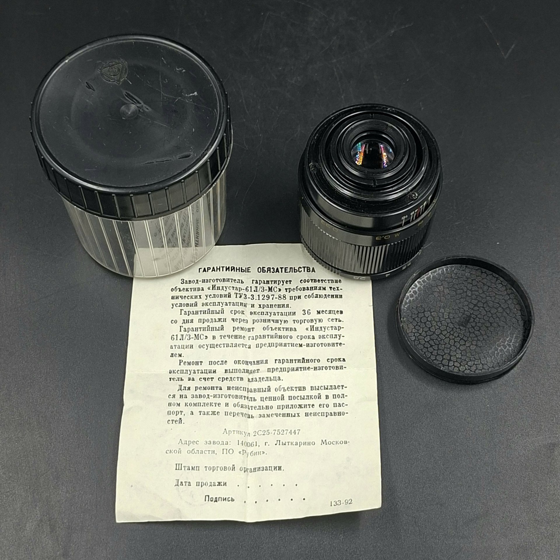 Объектив "Индустар-61Л/З-МС" для камер типа "Зенит" в оригинальном футляре с паспортом, пластик, металл, Лыткаринский завод оптического стекла (ЛЗОС), Российская Федерация, 1993 г.