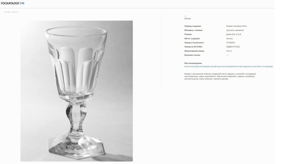 Бокал со скругленными гранями и ножкой, переходящей в шестиугольное основание, хрусталь, гранение, Российская империя, 1870-1900 гг.