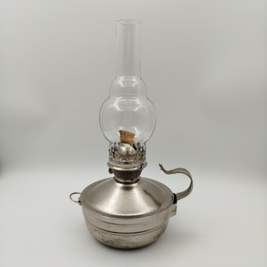 Лампа керосиновая на фигурной ножке с декоративной композицией в виде бабочки в окружении цветов, горелка в подборе (завод «Металламп»), металл, молочное стекло, роспись, Завод «Металламп», Российская империя, 1900-1915 гг.