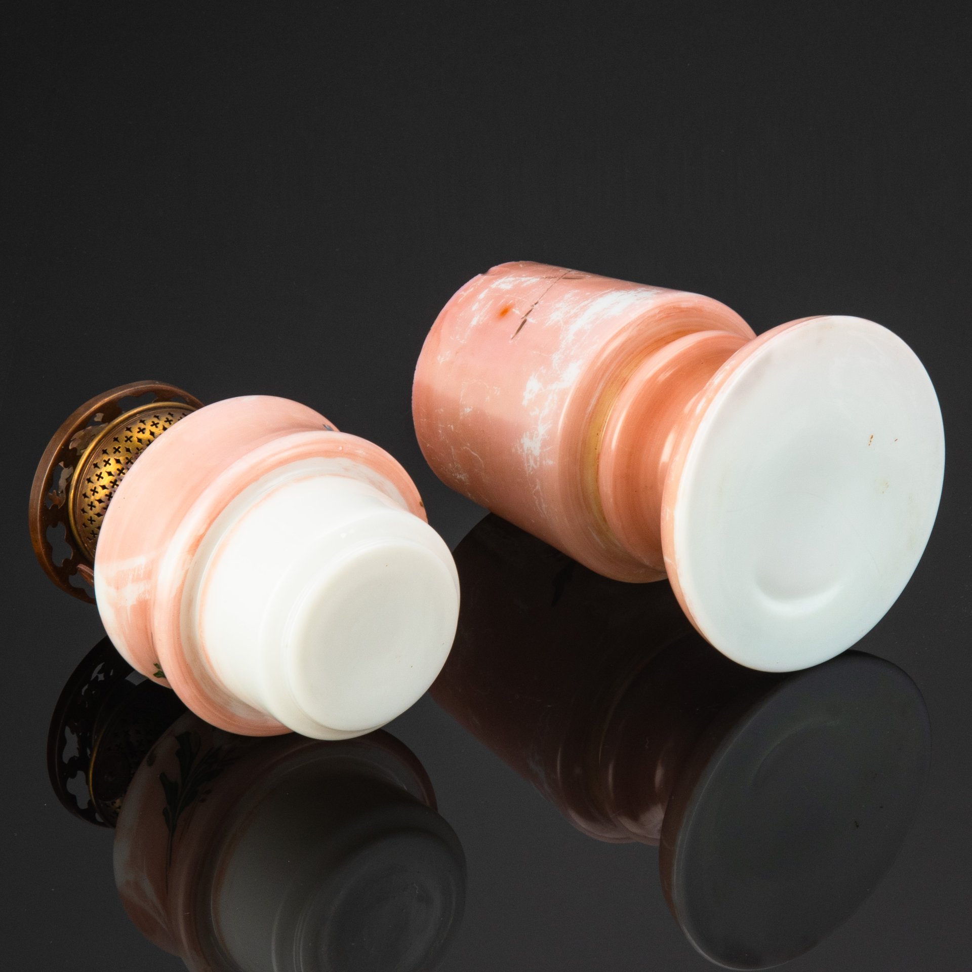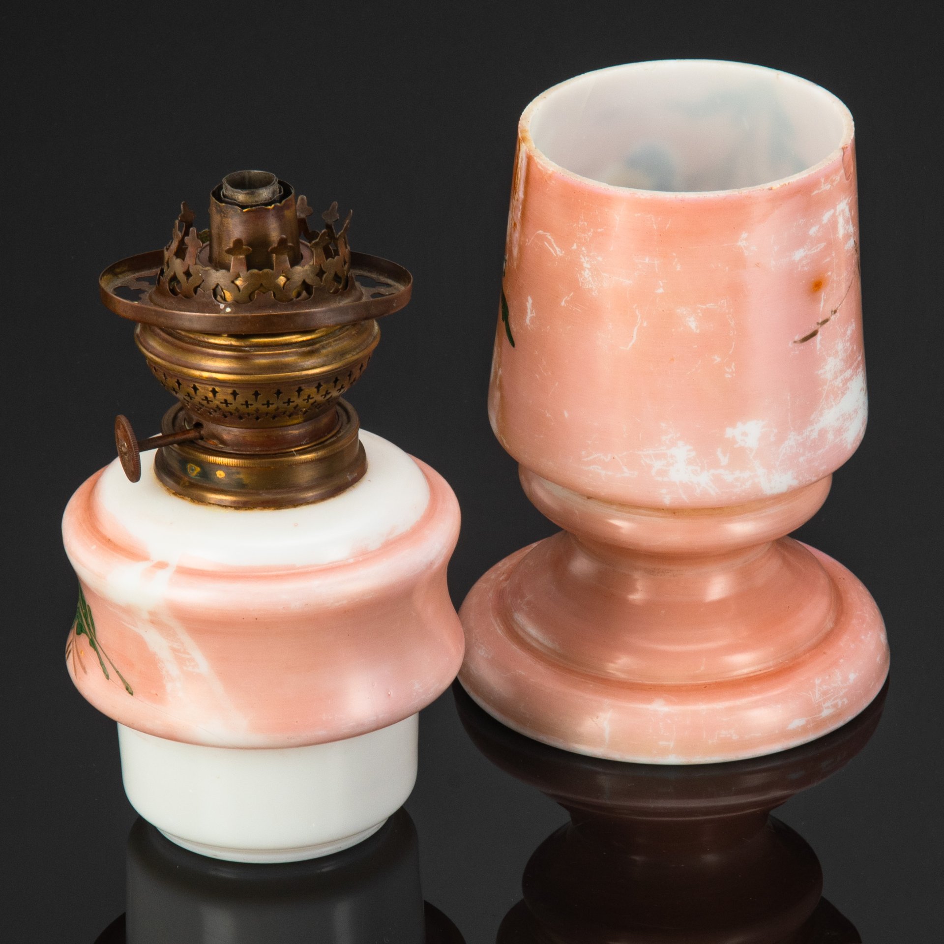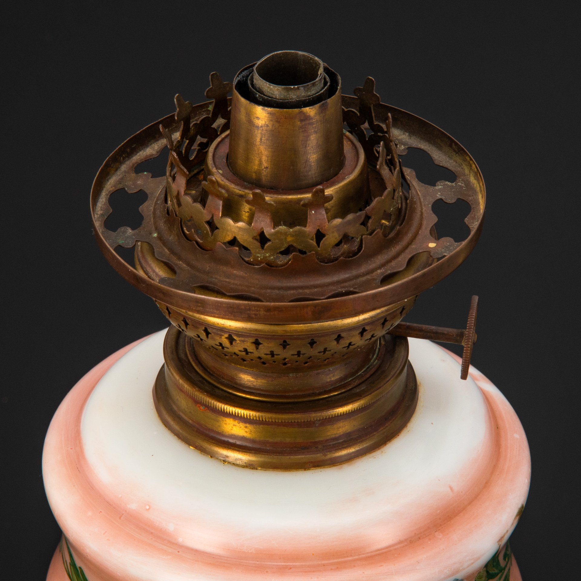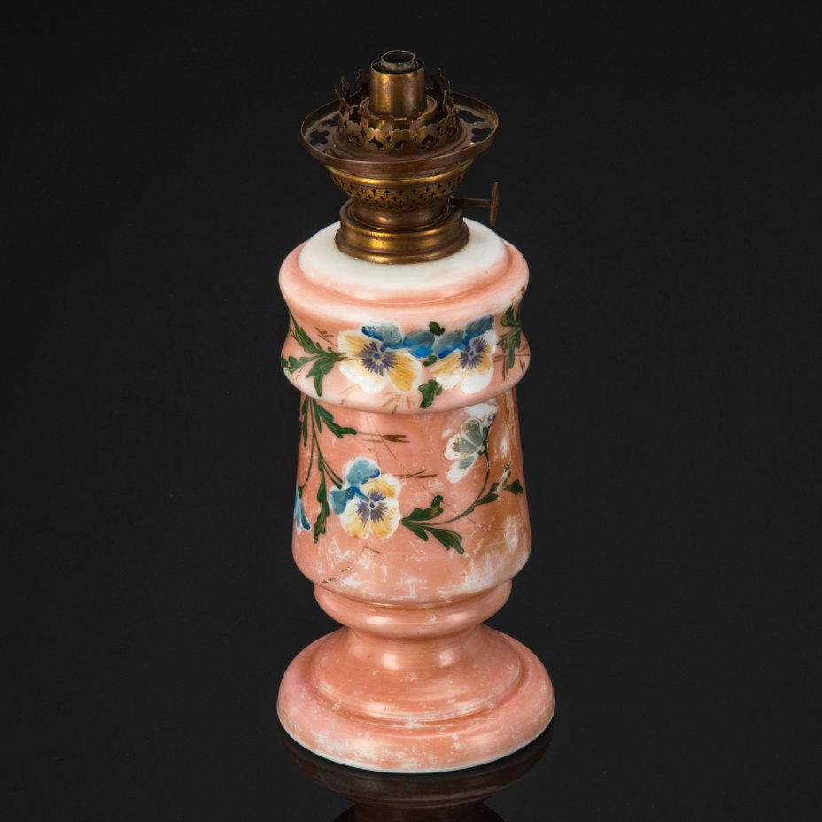 Лампа керосиновая на фигурной ножке с декоративной композицией в виде бабочки в окружении цветов, горелка в подборе (завод «Металламп»), металл, молочное стекло, роспись, Завод «Металламп», Российская империя, 1900-1915 гг.