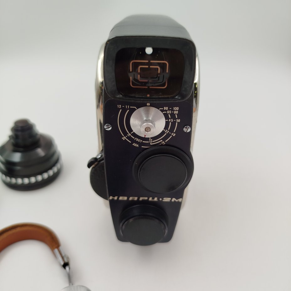Кинокамера "Нева-2" в футляре с комплектующими, металл, стекло, пластик, ЛОМО (Ленинградское оптико-механическое объединение), СССР, 1963-1976 гг.