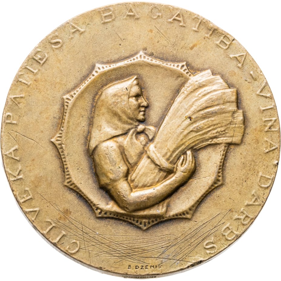 Памятная настольная медаль в честь Карлиса Улманиса и 5-й годовщины Переворота 1934 года, медальер Буркард Дзенис, фирма Huguenin Frères (Швейцария), бронза, Латвия, 1939 г.