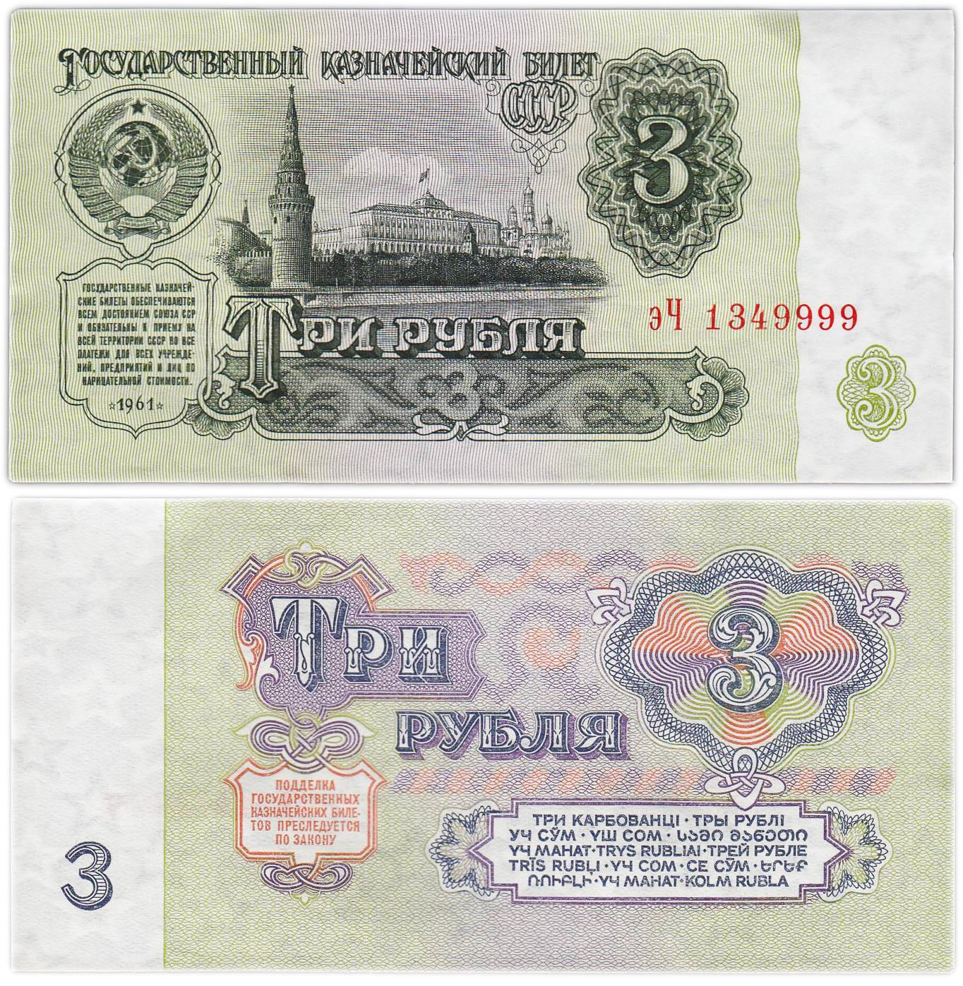 3 рубля 1961 красивый номер 1349999