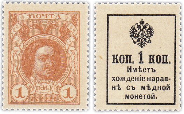 купить 1 копейка 1915 (1916) Деньги-Марки, 2-й выпуск (Петр I) ПРЕСС