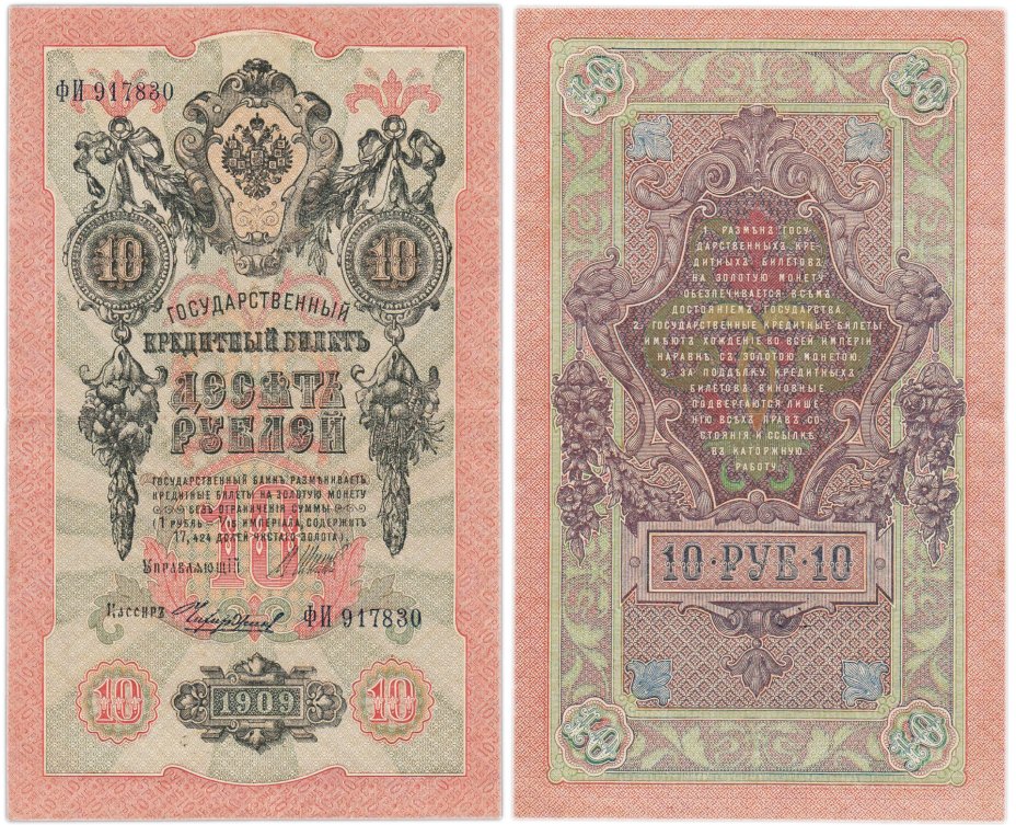 10 рублей 1909 управляющий Шипов, кассир Чихиржин