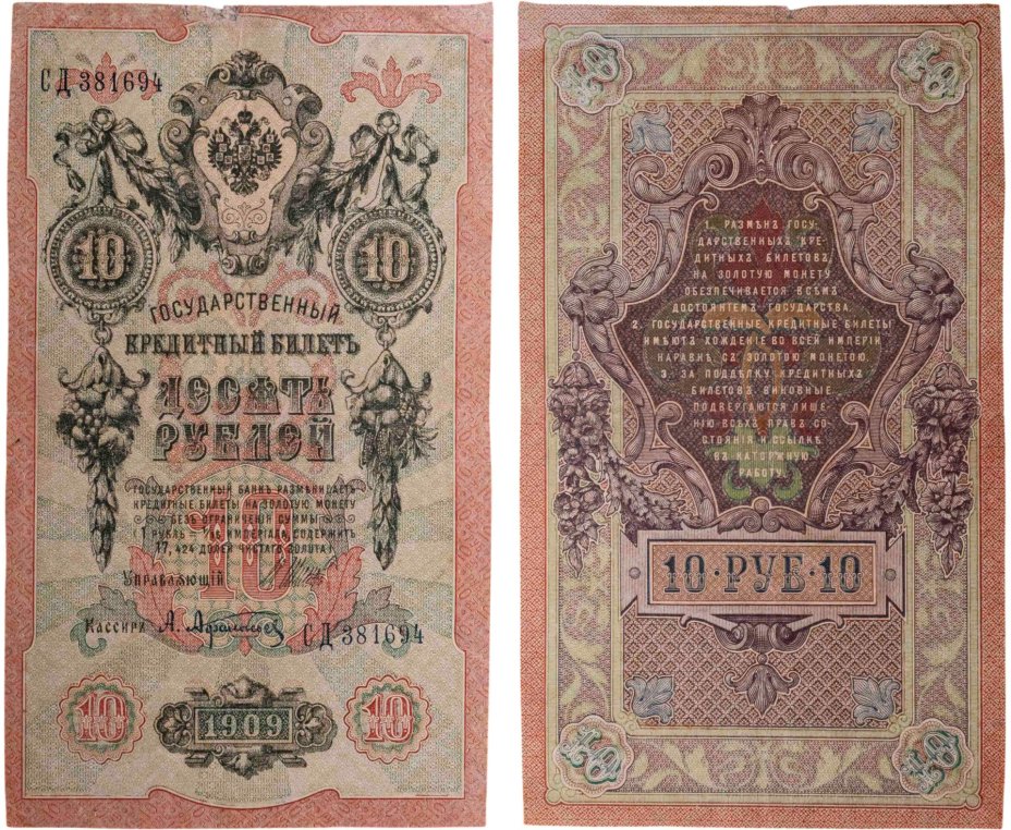 купить 10 рублей 1909 управляющий Шипов, кассир Афанасьев