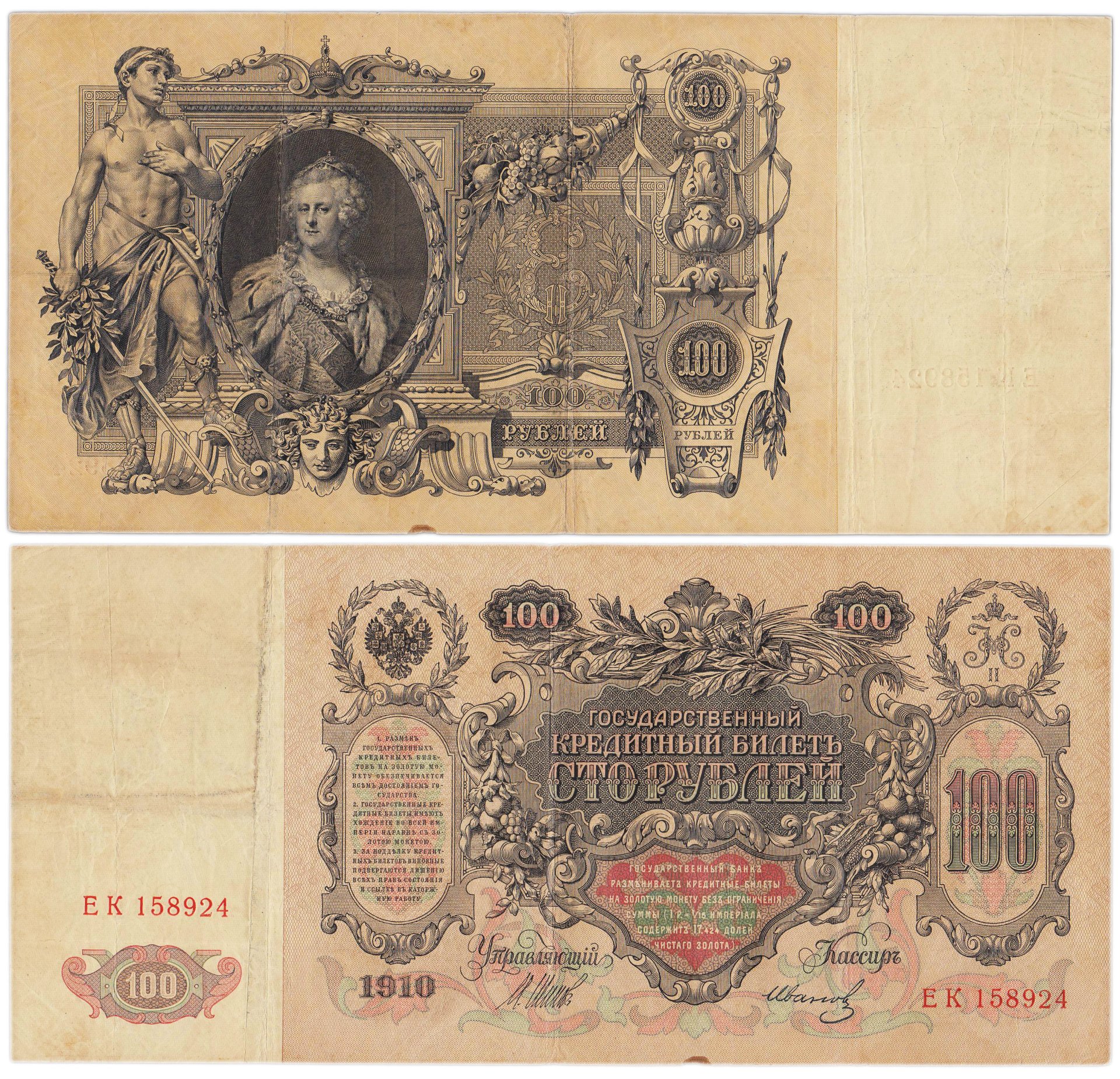 Многие обладатели этой красивой сторублевки считают, что, она была выпущена во времена царствования Екатерины II. Этот государственный кредитный билет является одним из самых больших по размерам денежным знаком за всю историю существования бумажных денег в России. Примечательно, что не смотря на тот факт, что с момента выпуска этой банкноты прошло более ста лет, до наших дней в руках коллекционеров и обычных людей сохранилось большое количество этих государственных билетов.