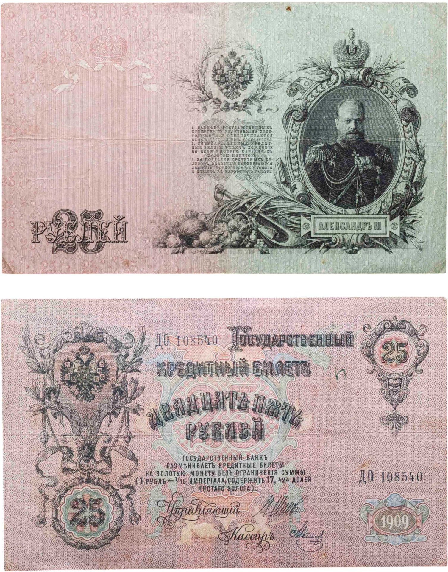 25 рублей 1909 Шипов, кассир Метц (Александр III) серия ДО