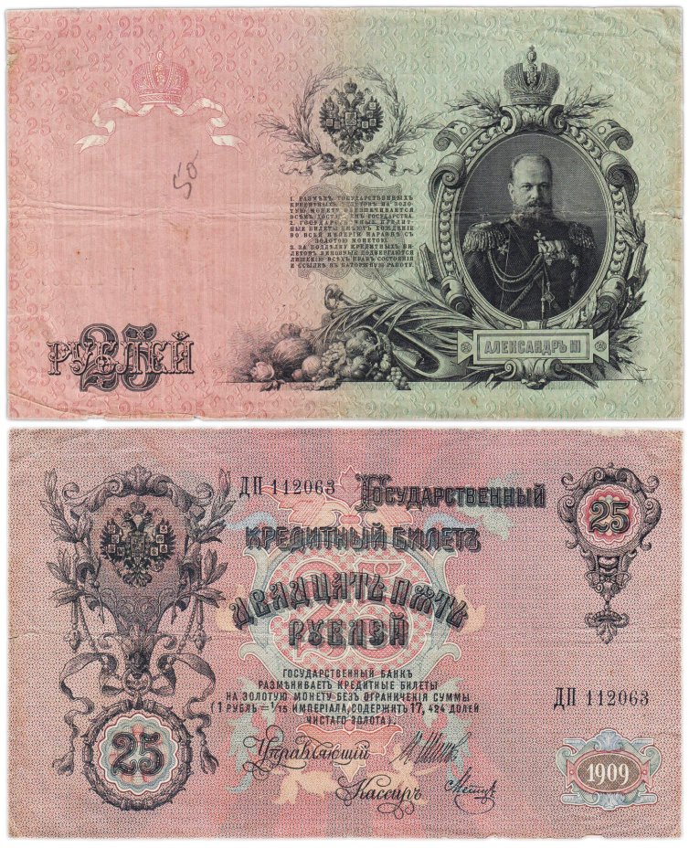 25 рублей 1909 Шипов, кассир Метц (Александр III)