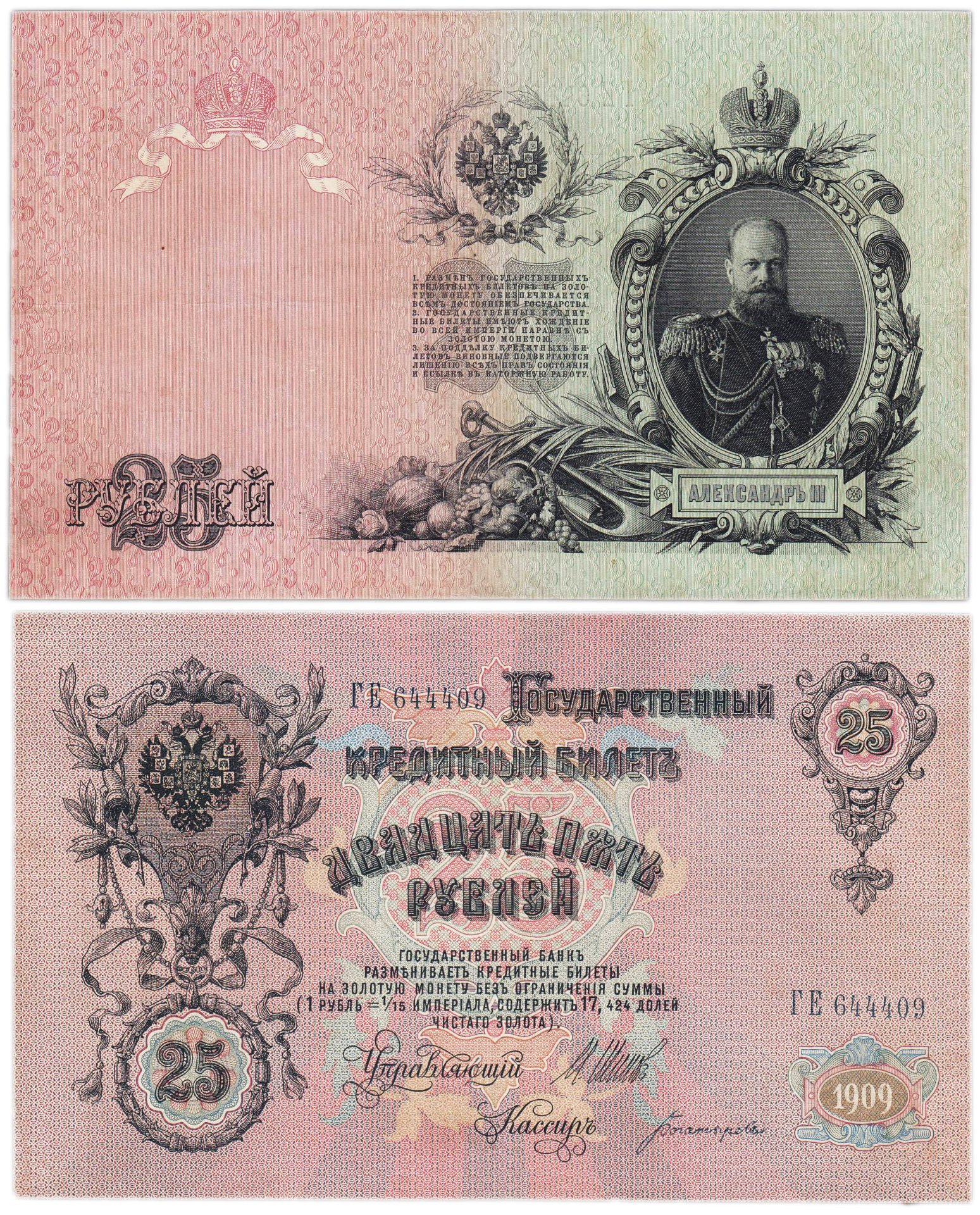 25 рублей 1909 Шипов, кассир Богатырев (Александр III)