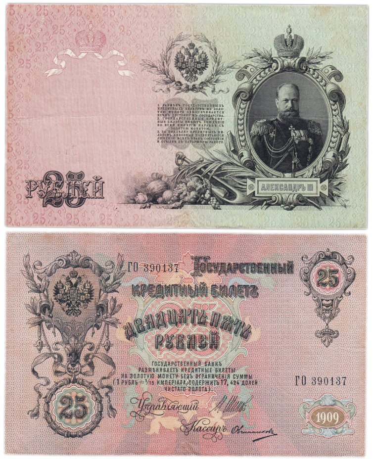 25 рублей 1909 Шипов, кассир Овчинников (Александр III)