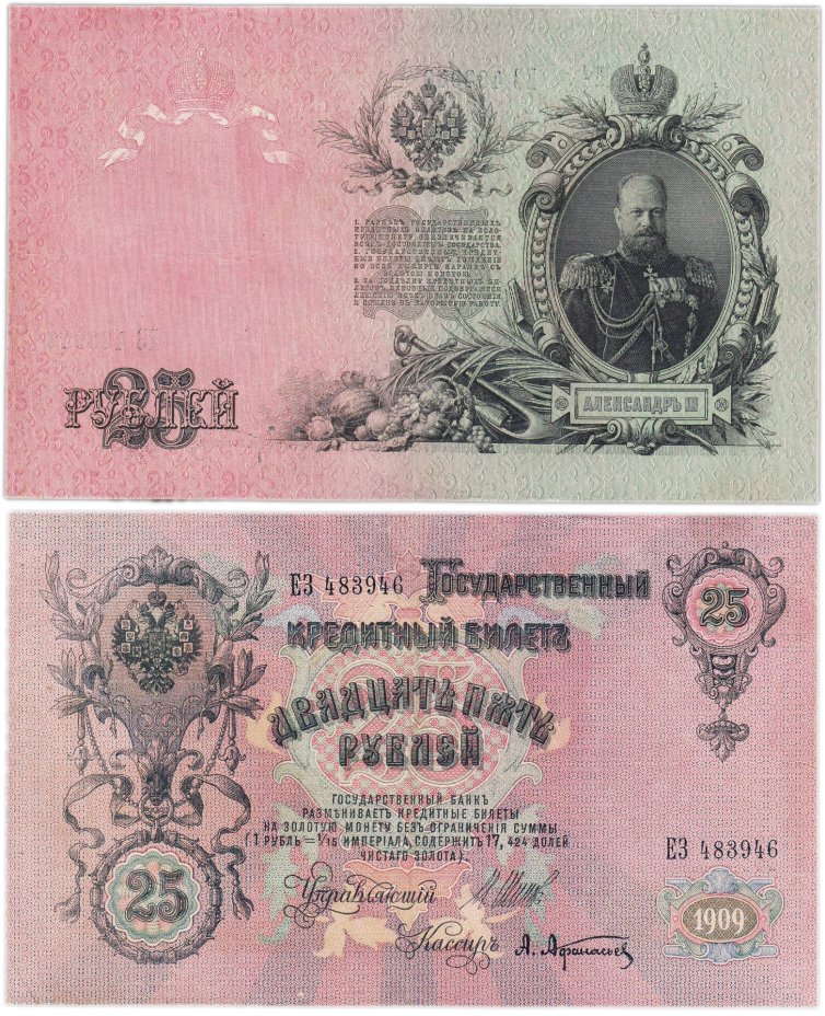 25 рублей 1909 Шипов, кассир Афанасьев (Александр III)
