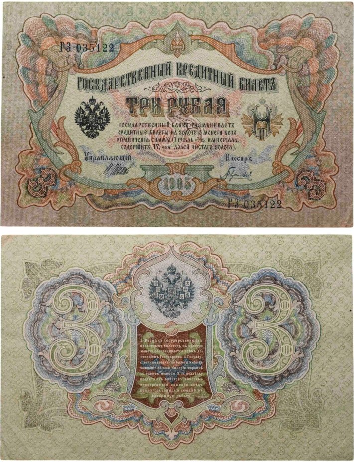купить 3 рубля 1905 управляющий Шипов, кассир Гаврилов