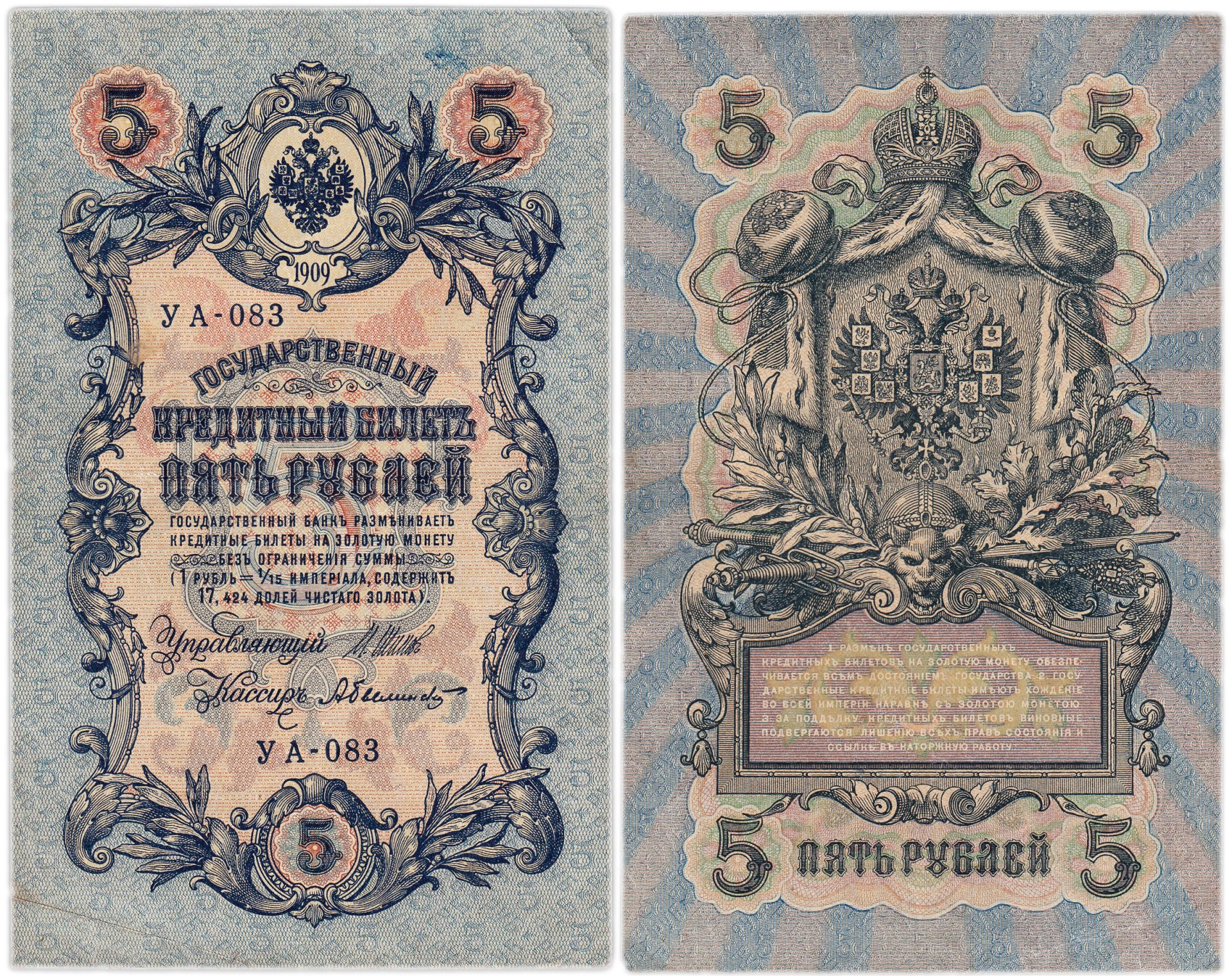 5 рублей 1909 управляющий Шипов, кассир Былинский