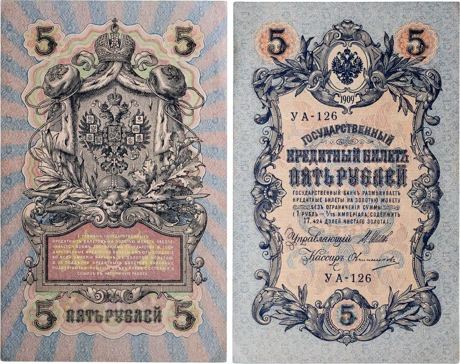 5 рублей 1909 управляющий Шипов, кассир Овчинников