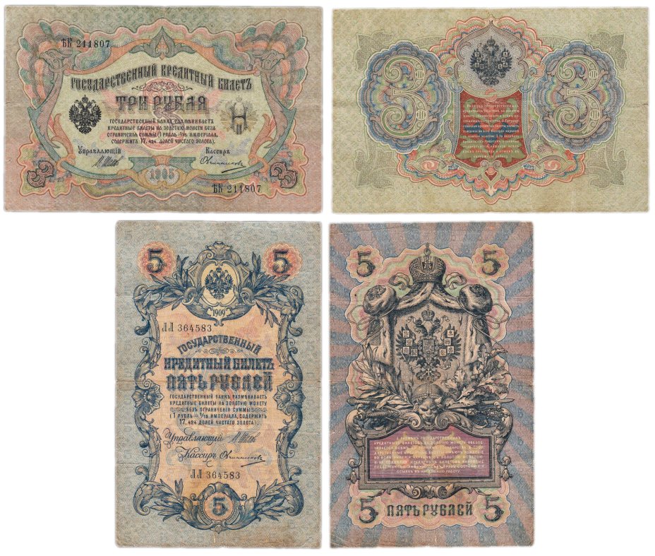 Набор из 2 банкнот 3 и 5 рублей 1905-1909 управляющий Шипов, кассир Овчинников