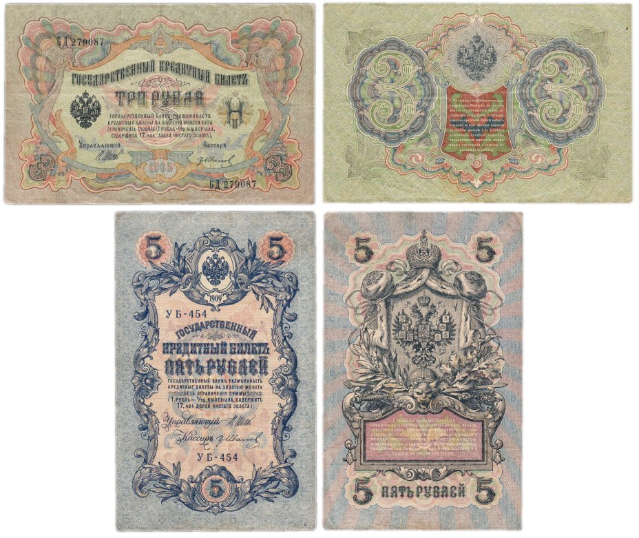 Набор из 2 банкнот 3 и 5 рублей 1905-1909 управляющий Шипов, кассир Гр. Иванов