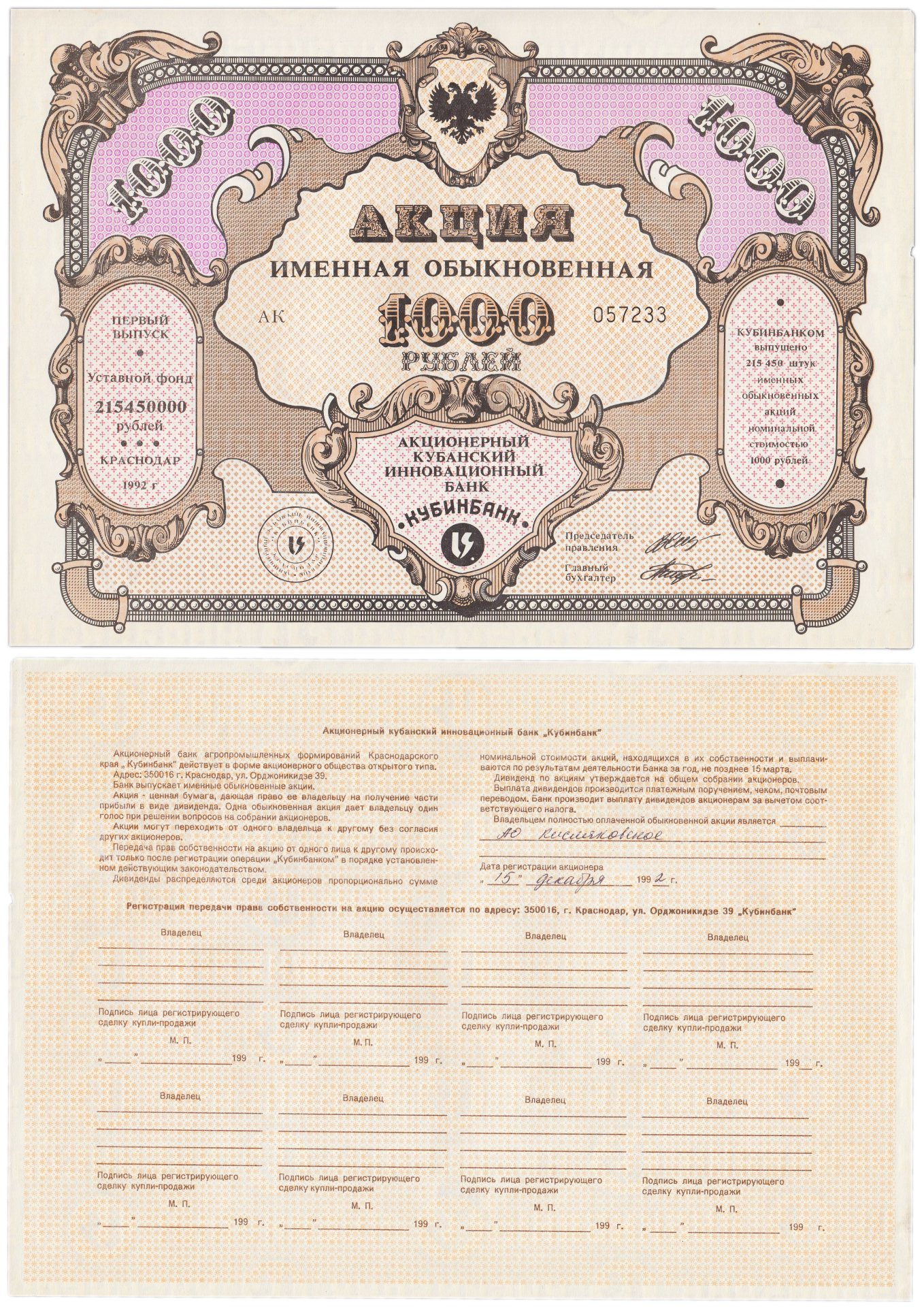 Купить Акция именная обыкновенная 1000 рублей Кубинбанк 1992