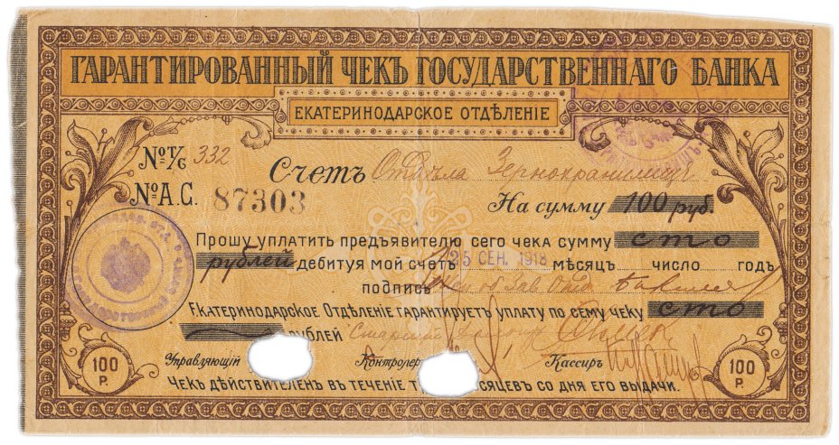 Чек Екатеринодарского отделения государственного банка 100 рублей 1918 с перфорацией