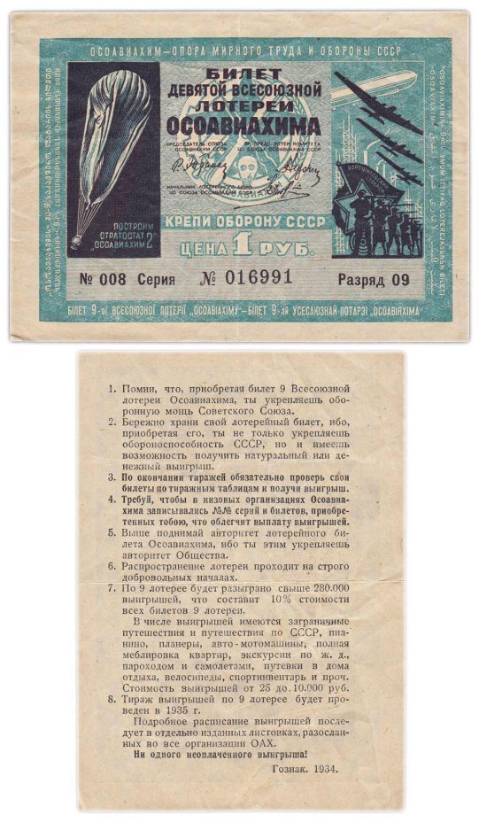 купить Лотерейный Билет Девятый Всесоюзной Лотереи ОСОАВИАХИМА 1 рубль 1934 (разряд 9)