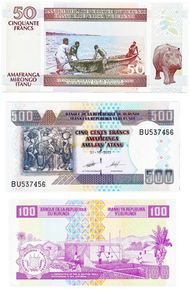Купить Бурунди набор из 3 банкнот 50, 100, 500 франков 2001 - 2013 Фауна ПРЕСС