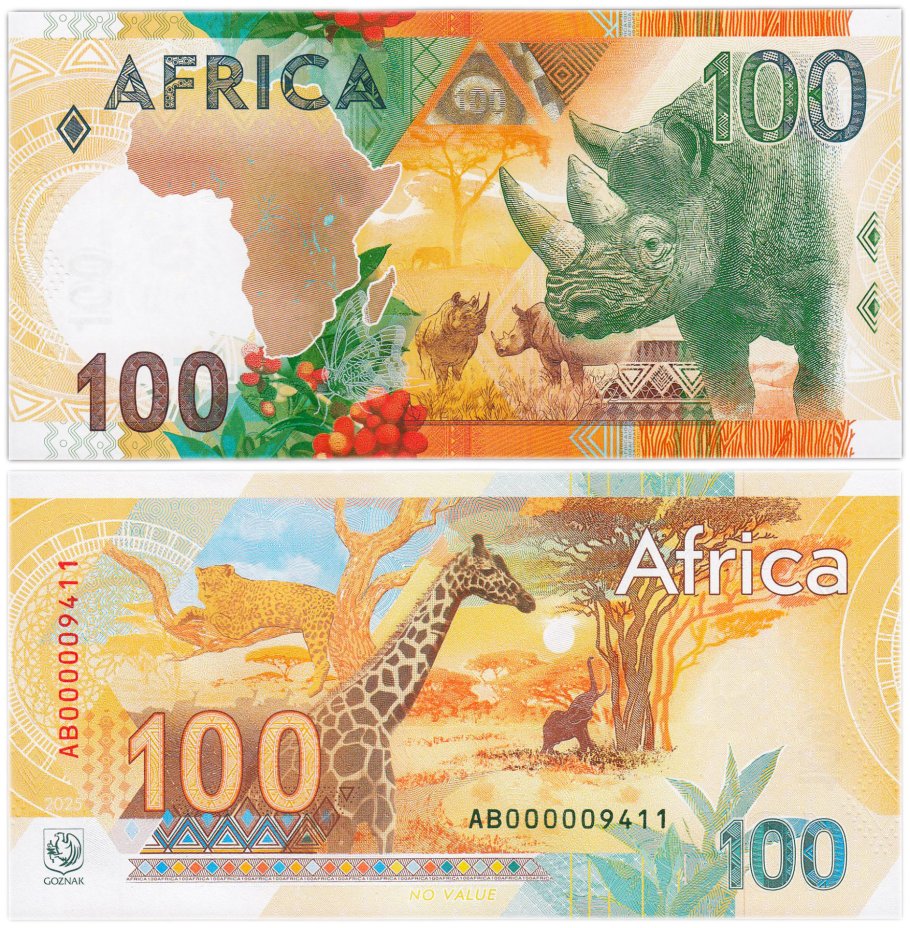ГОЗНАК тестовая банкнота 100 2025 Африка - Носорог