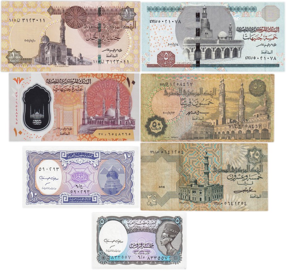 Практически все египетские банкноты содержат изображения культурно-исторического наследия страны, древнеегипетские мотивы или исламские постройки. Так на лицевой стороне банкноты 10 пиастров можно увидеть изображение знаменитого сфинкса, пирамид, а на оборотной – Мечеть Мухаммада Али в Каире. Главными «героями» банкноты 5 пиастров являются – Нефертити и фараон Тутанхамон.