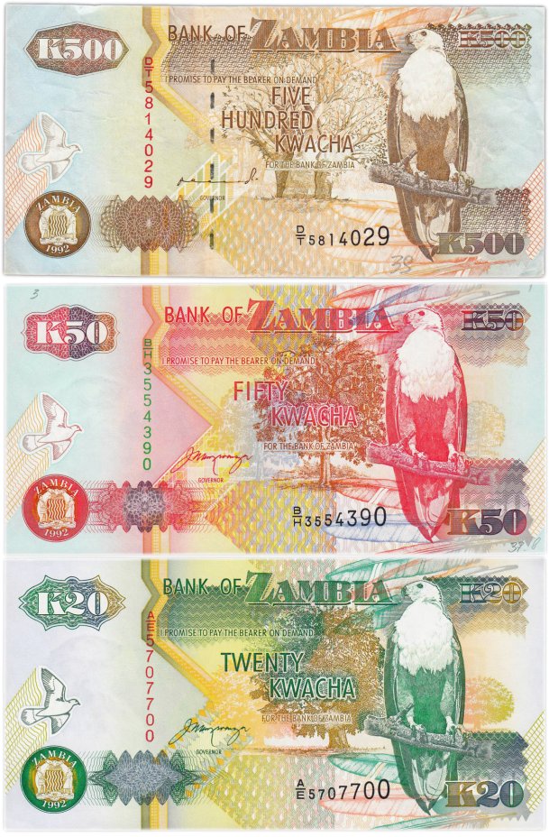 Замбия набор из 3 банкнот 20, 50, 500 квача "Попугаи" 1992