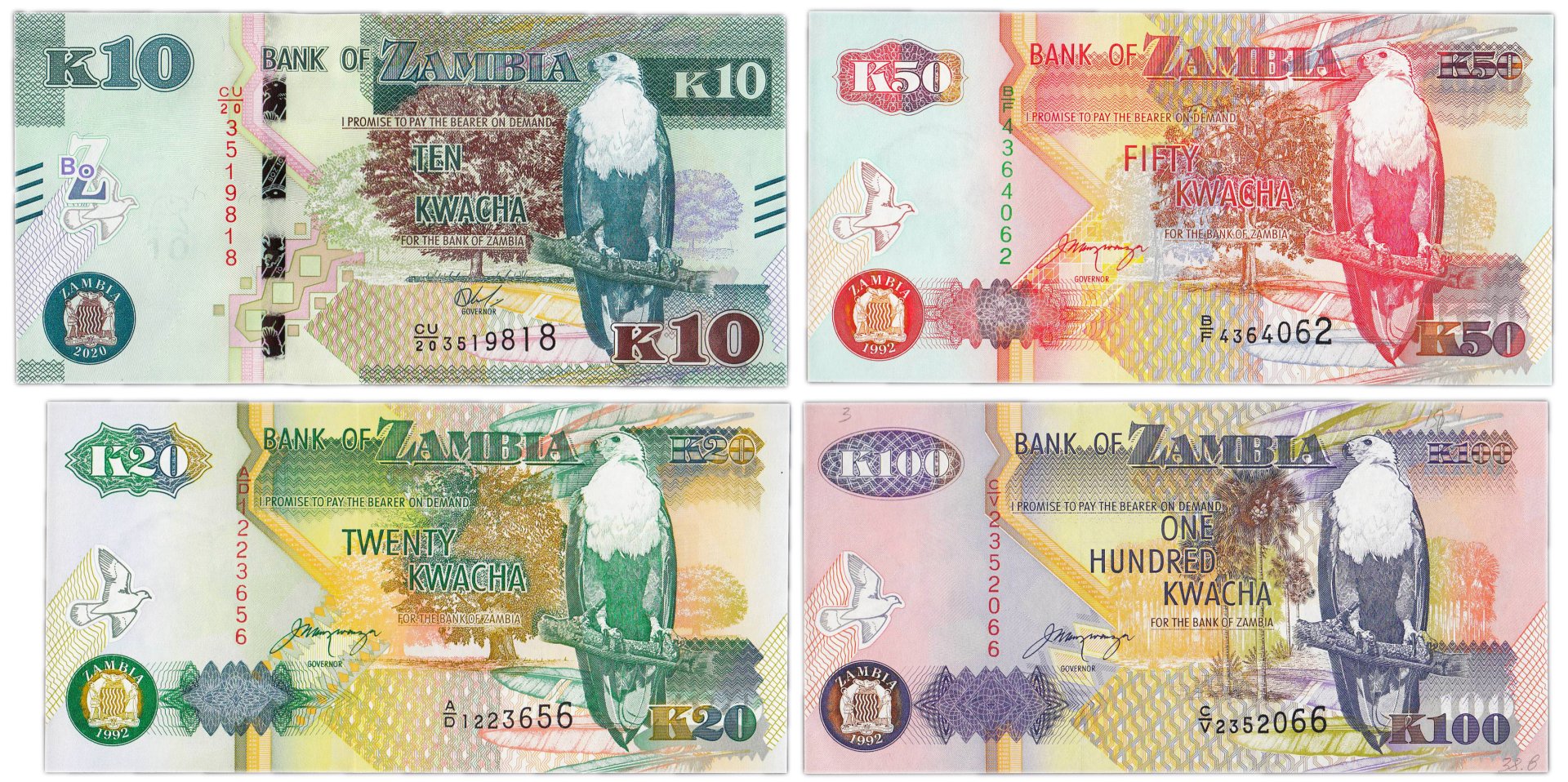 Замбия набор из 4 банкнот 10, 20, 50, 100 квача "Попугаи" 1992-2020